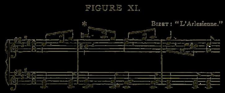 In other kinds of music there is much more dissonance. Why? Because, since Palestrina’s day, musicians have gradually found out many new effects which appeal to them strongly. Do you like to eat nothing but sugar, to smell nothing but sweet flowers, to see no colors in a painting but quiet, soft ones, no forms but graceful curves? Not at all; you want some variety, some contrast, some striking impressions. We like some saltness and bitterness in our food (more as we grow older), some pungency in odors, some vivid reds and yellows, and some sharp, bold angles in pictures. Well, just so we like dissonances in music because they keep the consonances from becoming insipid; and all modern music is plentifully seasoned with them. The next time you hear any music, see if you can detect some of the dissonances, and notice how exciting and refreshing they are.