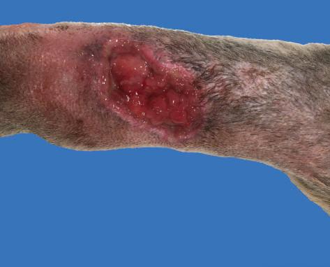 Aspeto macroscópico da reparação de ferida cutânea, com proliferação granular do tecido de granulação (seta).