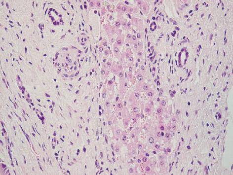 Bovino, fígado. Área de fibrose hepática com nódulo de hiperplasia regenerativa dos hepatócitos (setas). Observe que as células hepáticas não se dispõem em cordões em torno da veia central; esta alteração da organização celular dificulta a sua nutrição e oxigenação e causa um ciclo vicioso de morte celular e regeneração desorganizada.
