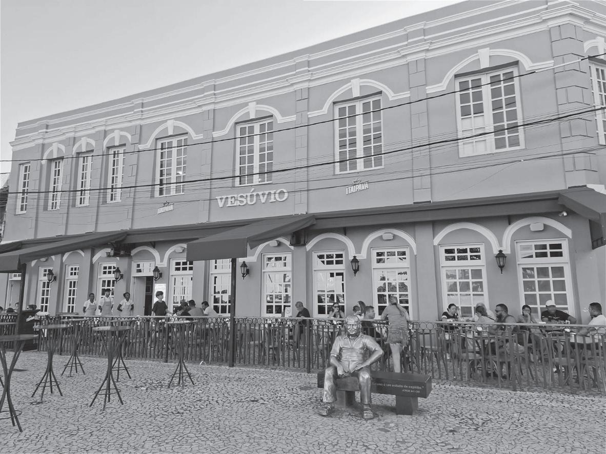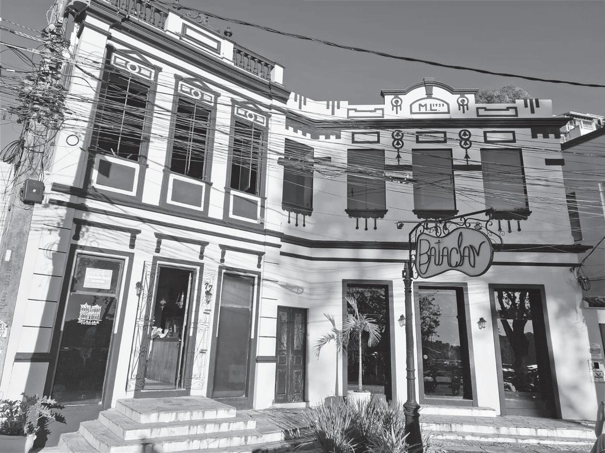 Vista exterior de dois lugares que foram cenário de Gabriela, Cravo e Canela. A Casa de Cultura Jorge Amado foi residência do autor que ali escreveu o seu primeiro livro, O País do Carnaval (1931) (A). O Café Vesúvio frente ao qual foi colocada uma estátua de Jorge Amado sentado num banco que convida a uma fotografia com o autor (B) e o Bataclan, antigo bordel que é hoje um restaurante (C).