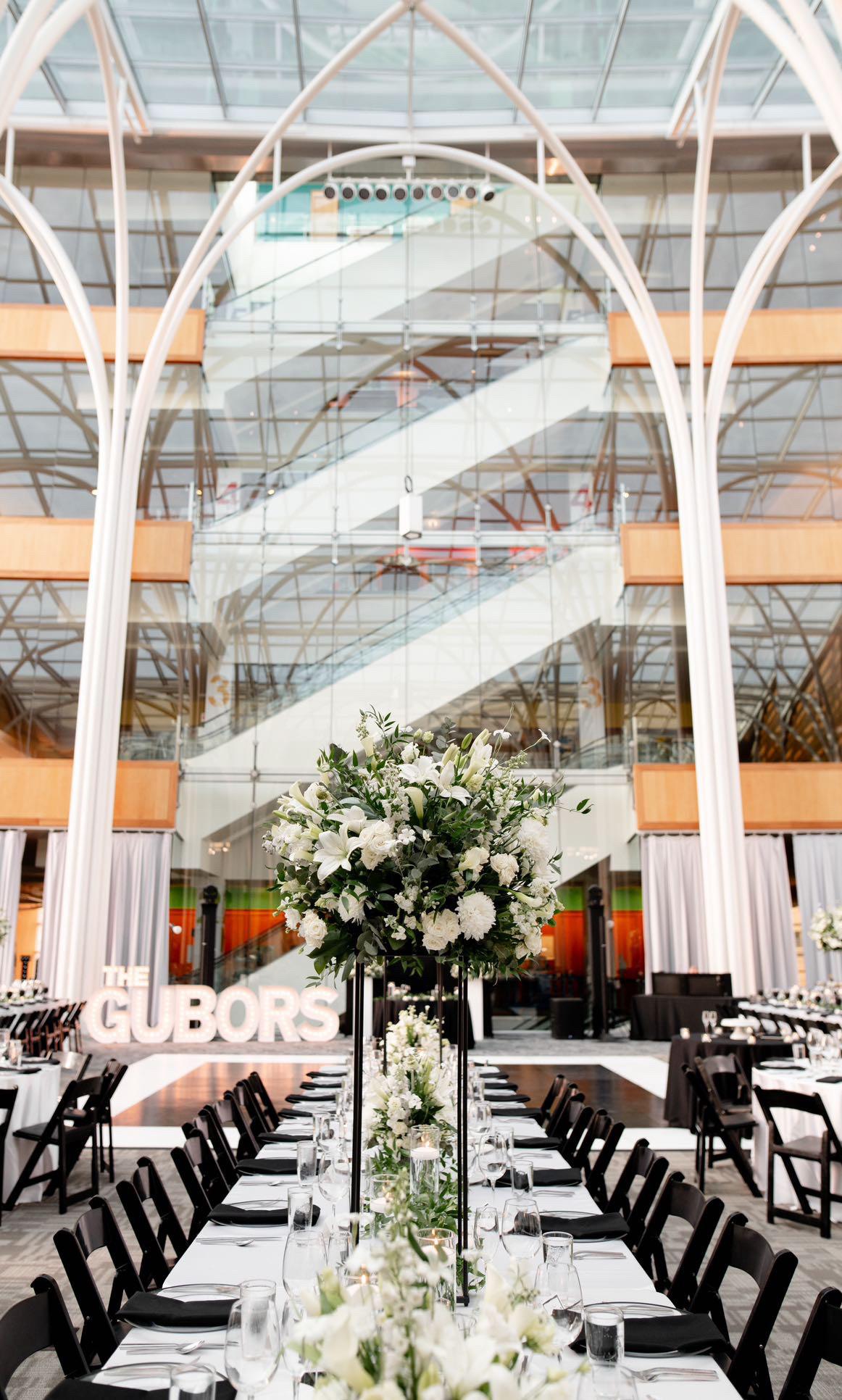 The décor was all about softening Walden’s modern, industrial space with organic, romantic touches. MDM Entertainment’s layered draping added warmth and depth—opaque ivory panels framed the ceremony beautifully, while sheer champagne fabric softened the reception ceiling. Sculptural serpentine tables and bentwood chairs brought natural movement, paired with ivory Lamour linens and fern napkins to echo the floral palette. The result was a warm, soulful design that blended timeless elegance with nature-inspired textures!