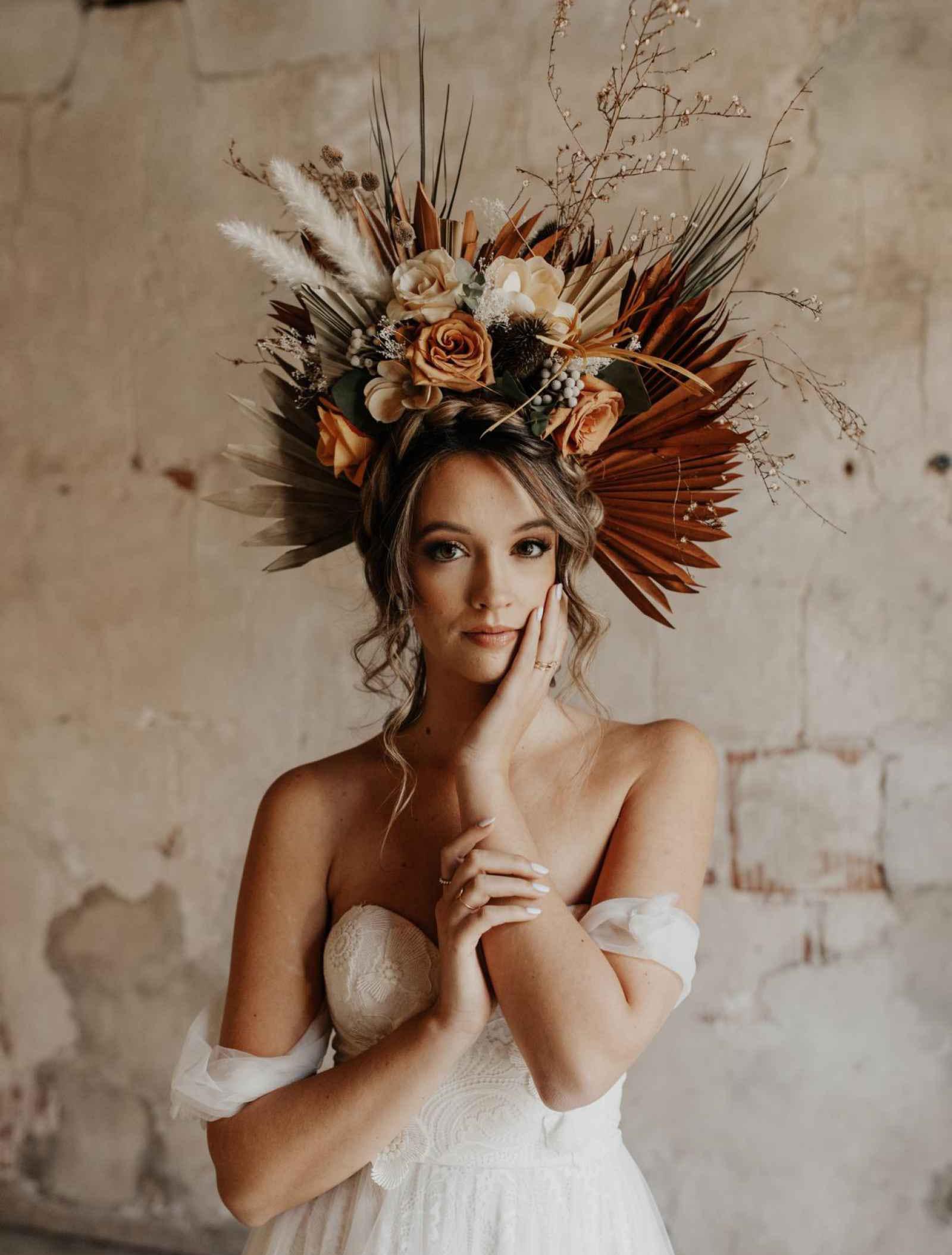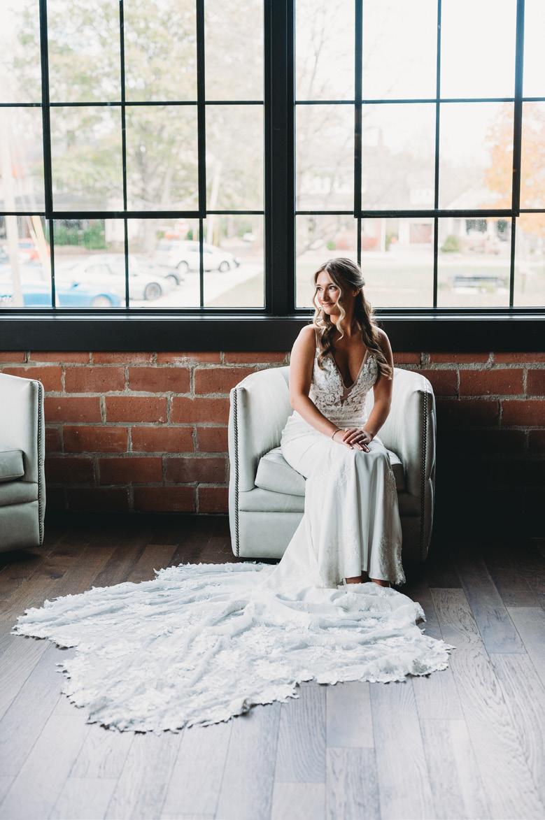 The bridal look for this shoot came together flawlessly thanks to a dream team of vendors! We found the perfect wedding gowns at Diana’s Bridal Boutique, who helped us select three styles that captured our theme of romantic, earthy and modern. For the ceremony, our bride wore a strapless gown with a flowing train that beautifully mirrored the soft drapery. For cocktail hour, she changed into a sleek, highneck look, followed by a basque-waist gown with a square neckline for the reception. We love how different the three gowns were, while still complementing the romantic aesthetic! To complete the effortlessly elegant vibe, we went with soft, natural glam makeup and a loosely styled, romantic updo.