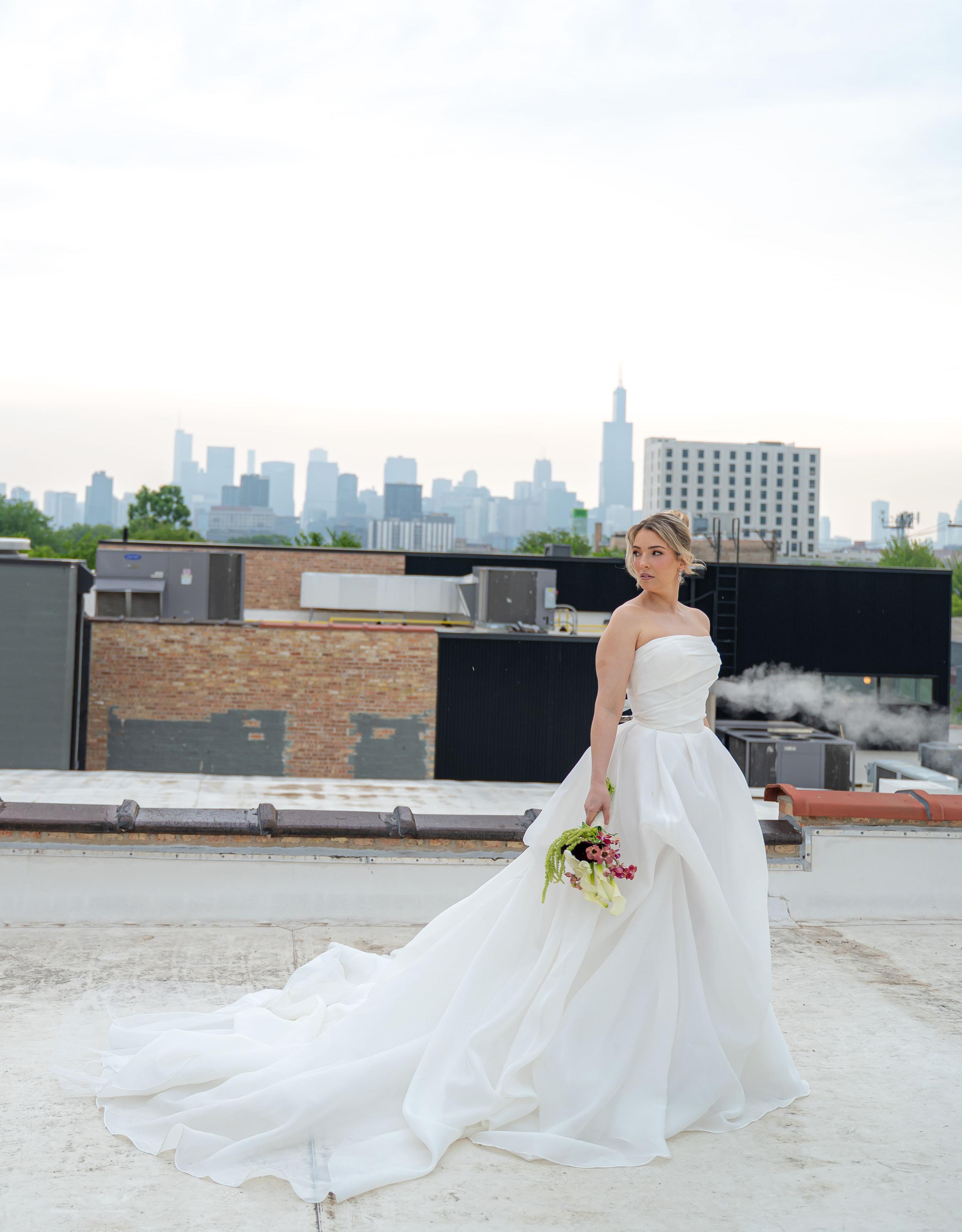 Walden is a venue that effortlessly blends modern industrial style with soft, romantic charm. With its high ceilings, exposed brick and beautiful natural light, the space offers a clean, versatile canvas that still feels warm and welcoming. For our shoot, its open layout and minimalist lines provided the perfect backdrop to layer in lush florals, flowing drapery and organic textures. Beyond its visual appeal, Walden’s commitment to sustainability and its in-house catering and bar services make it an ideal choice for couples looking to create an intentional, earth-inspired celebration. We also love the rooftop views of the Chicago skyline, perfect for these portraits captured by Trysh Jaeger Photography!