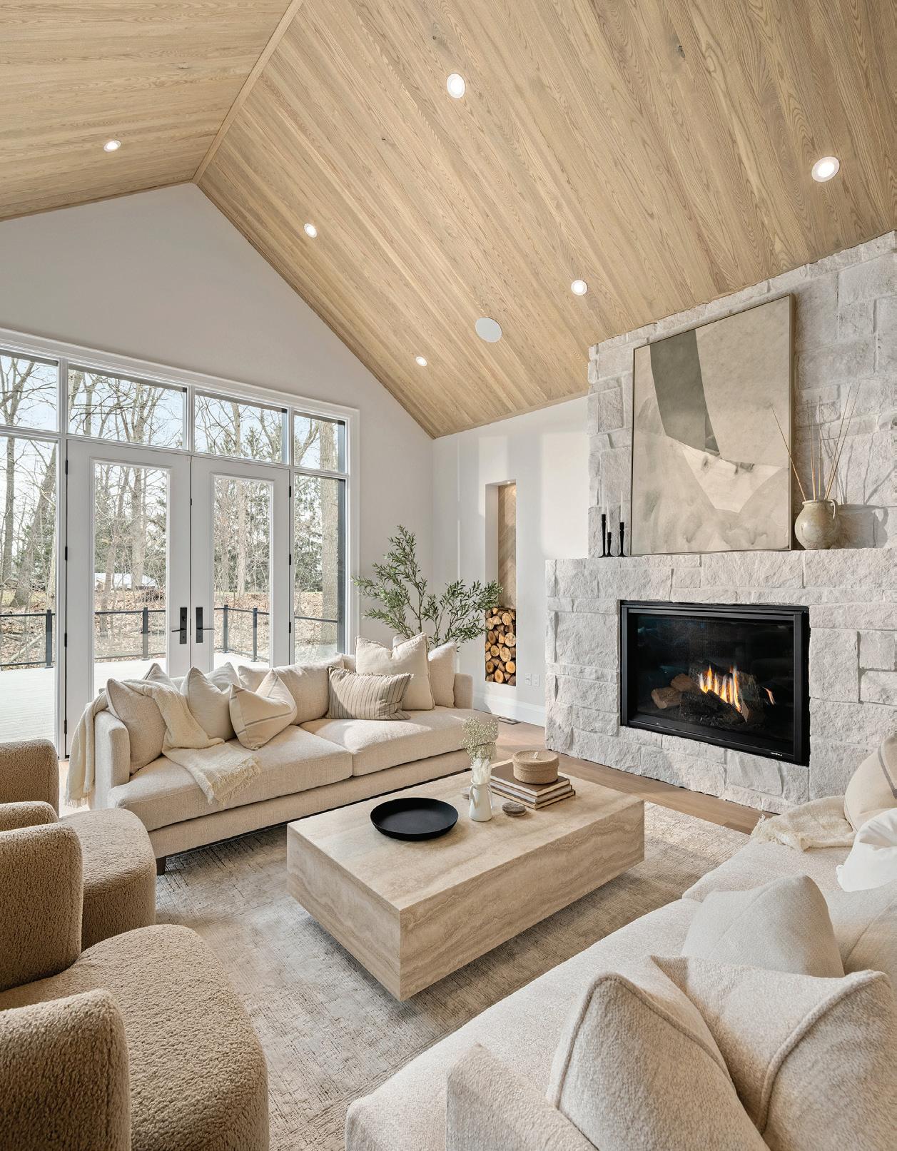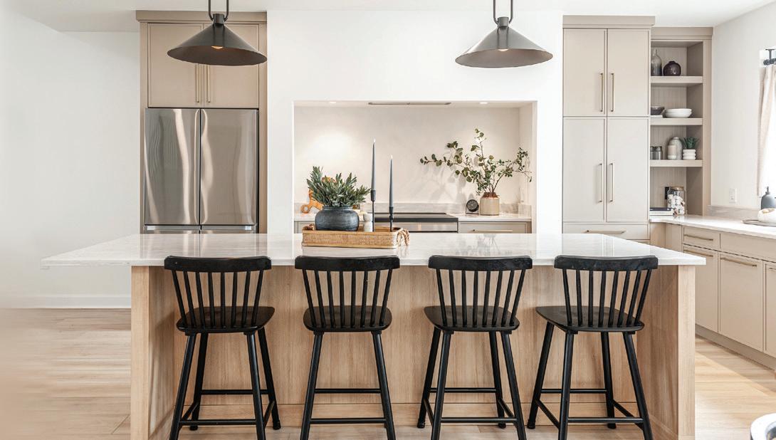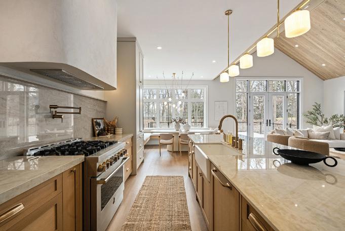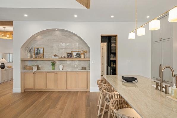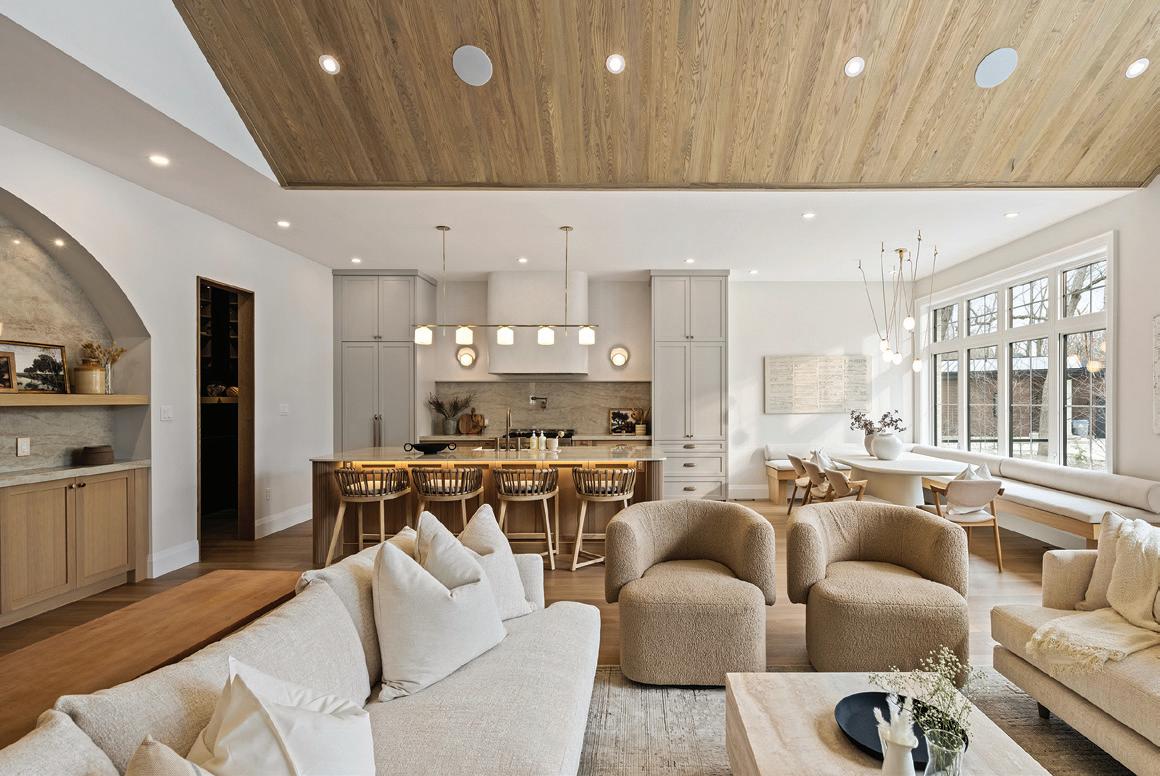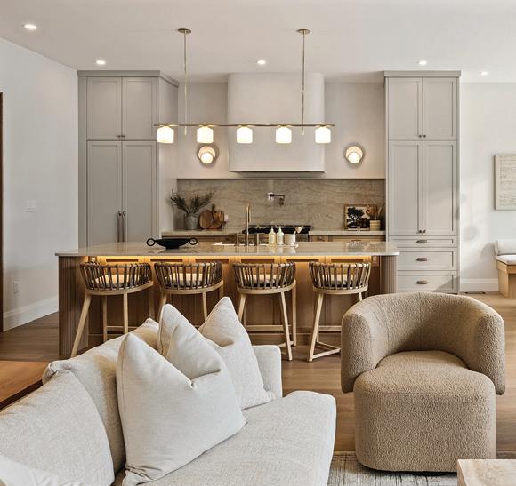 CLOCKWISE FROM THE TOP The beautifully designed openconcept living space blends natural textures and warm neutrals for a sophisticated yet cozy feel. • The kitchen is defined by the range hood and hanging light fixture that echo the arches found throughout the home. • The timeless exterior features light-toned brickwork and boldly contrasting black window frames. Steep gable rooflines add architectural interest and curb appeal while framing the front entry.