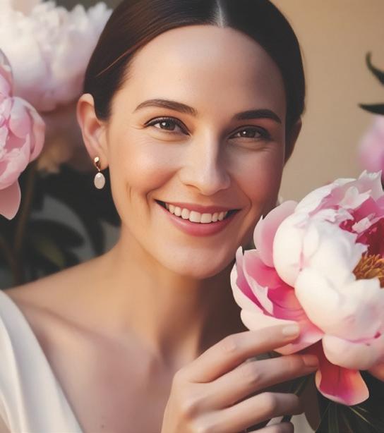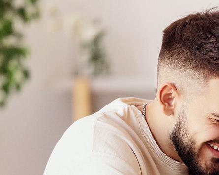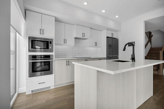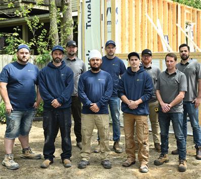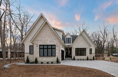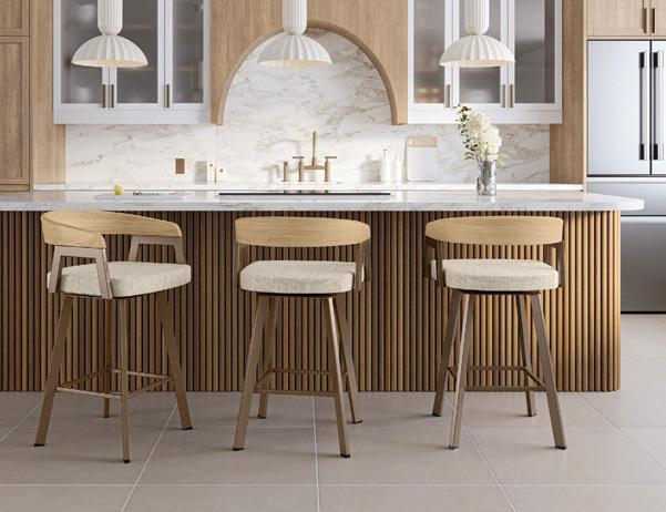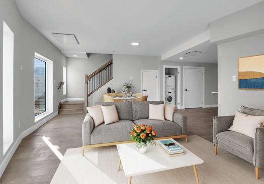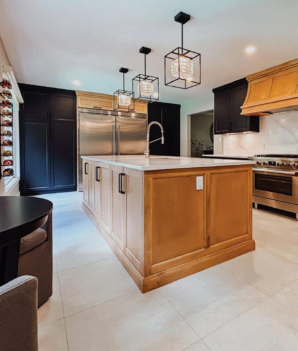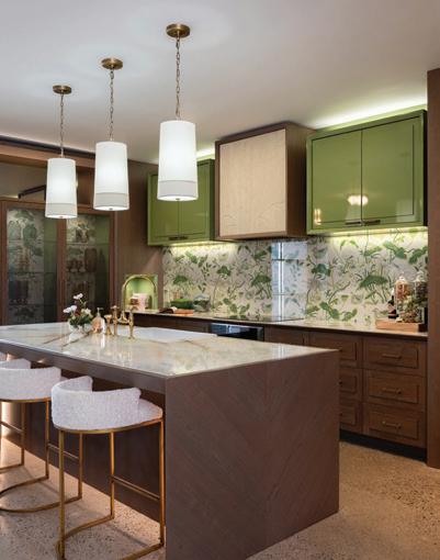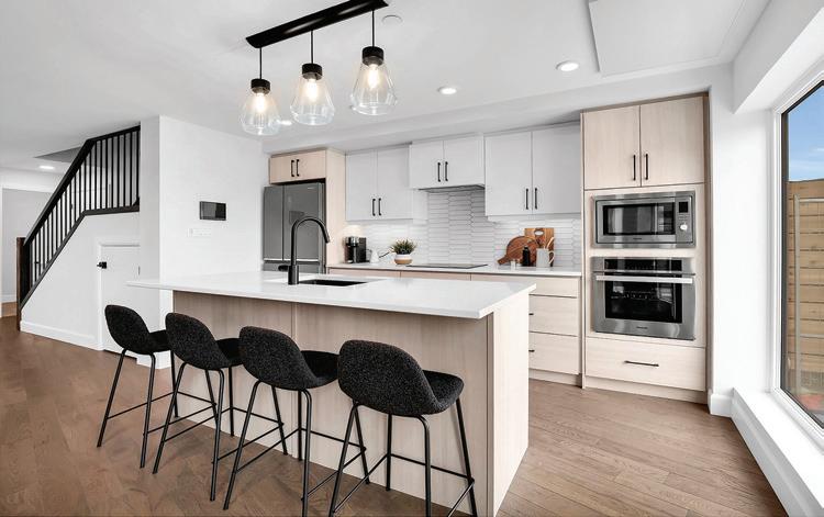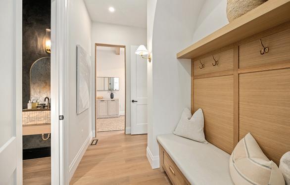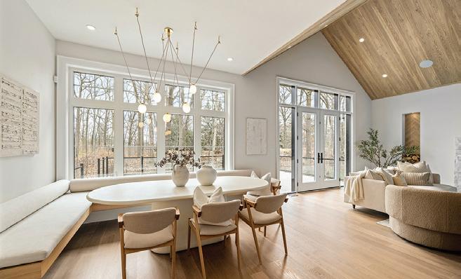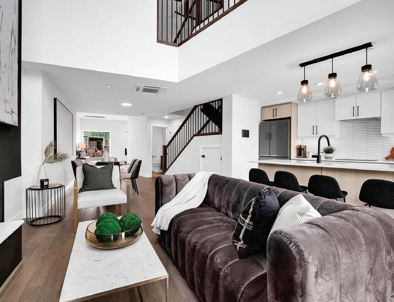 CLOCKWISE FROM THE TOP The beautifully designed openconcept living space blends natural textures and warm neutrals for a sophisticated yet cozy feel. • The kitchen is defined by the range hood and hanging light fixture that echo the arches found throughout the home. • The timeless exterior features light-toned brickwork and boldly contrasting black window frames. Steep gable rooflines add architectural interest and curb appeal while framing the front entry.