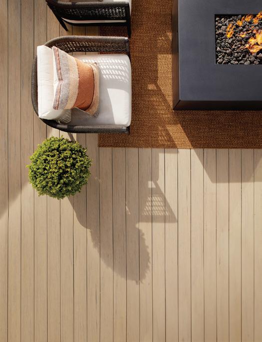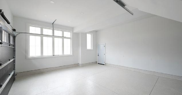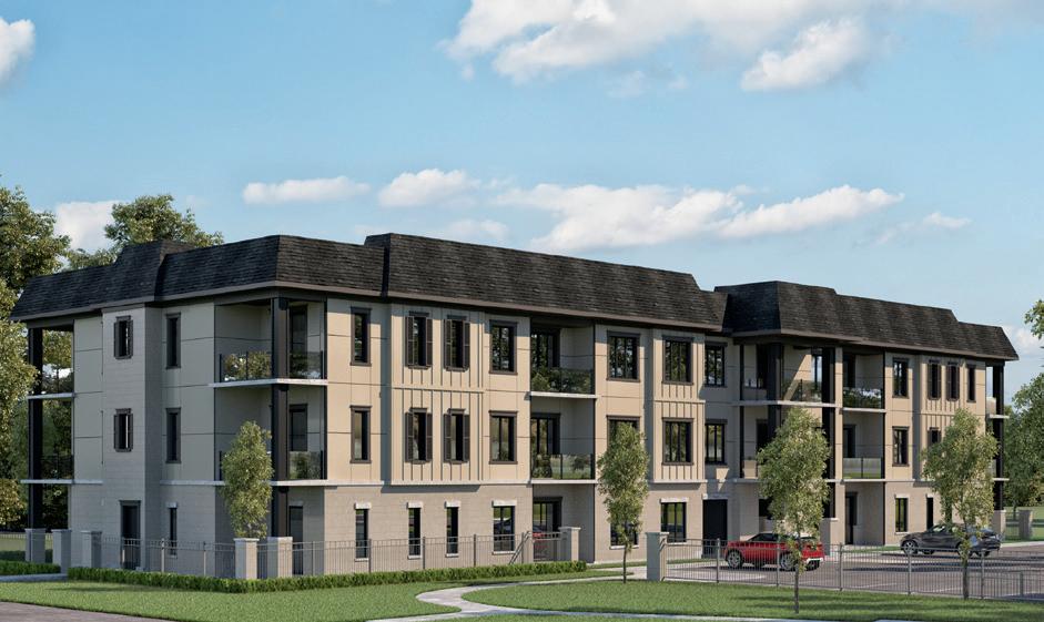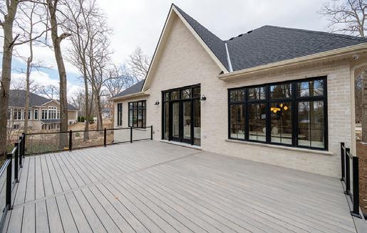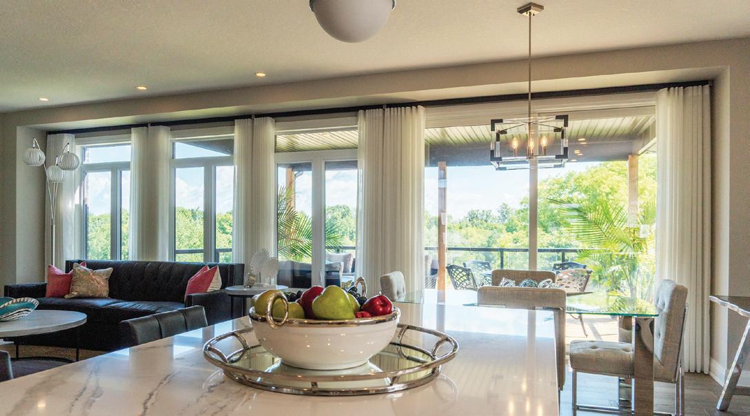 great room/kitchen/dinette — sits on three-quarters of an acre. The exterior Laffitt Stone in Oasis finish will hold its colour through the years and complements the elevation’s off-white stucco.