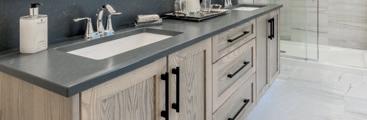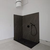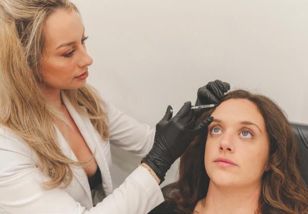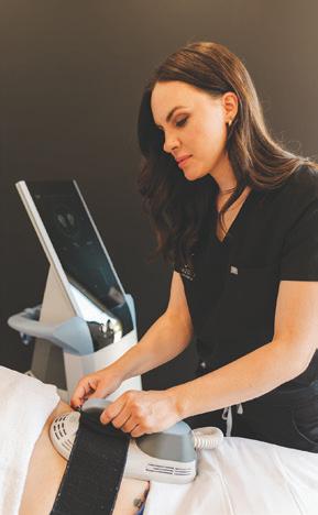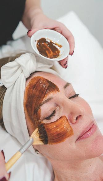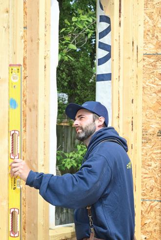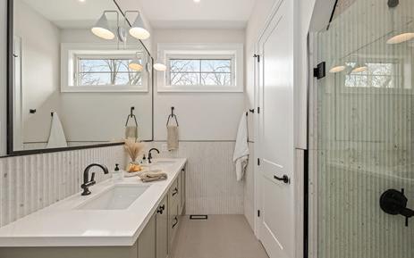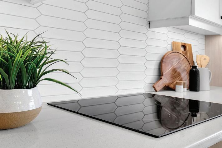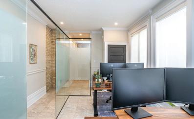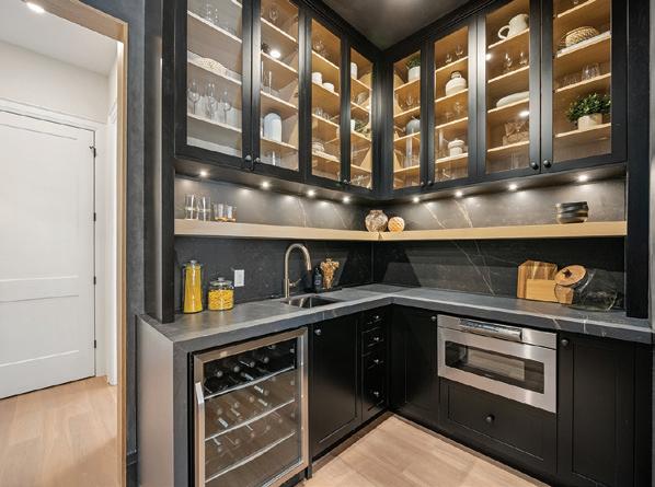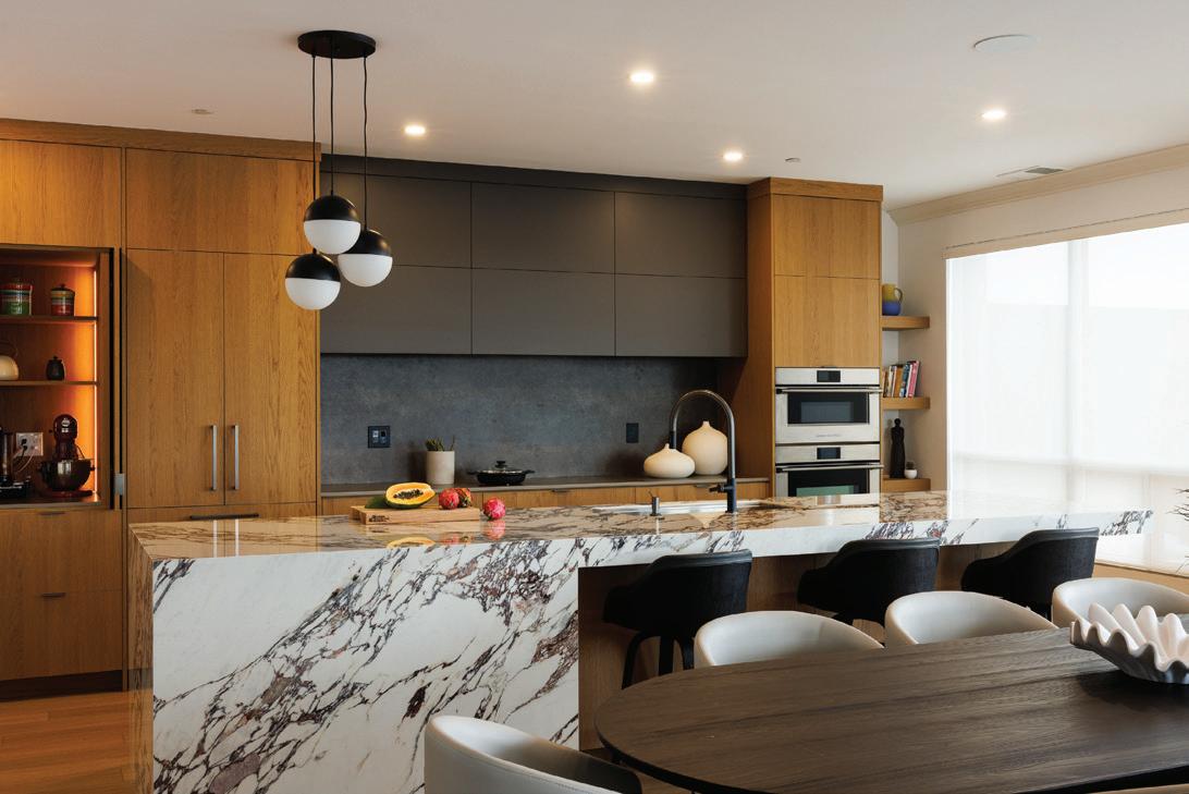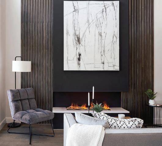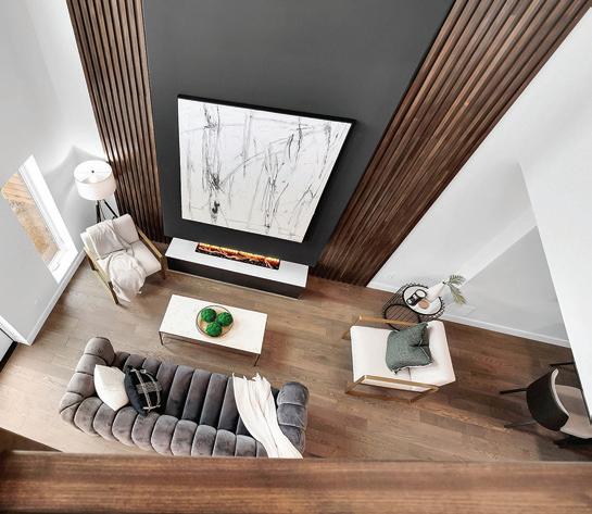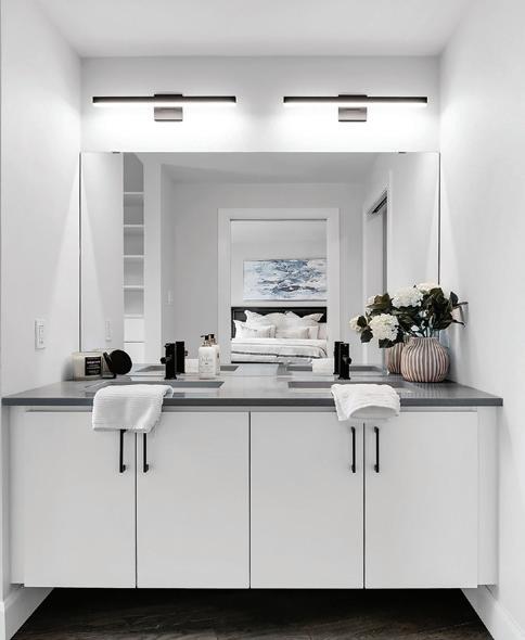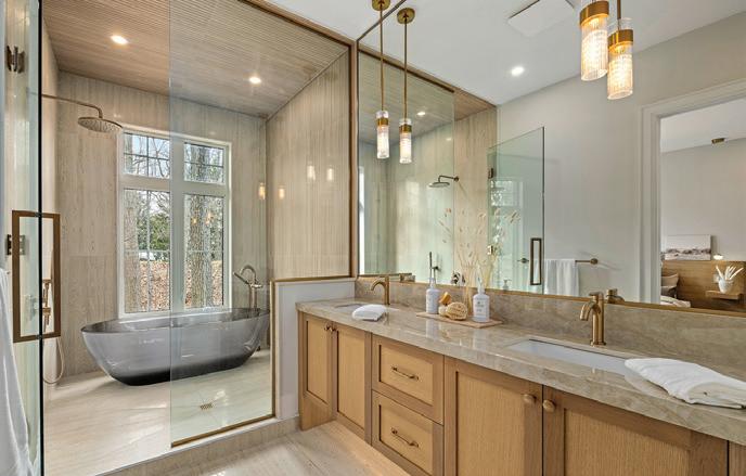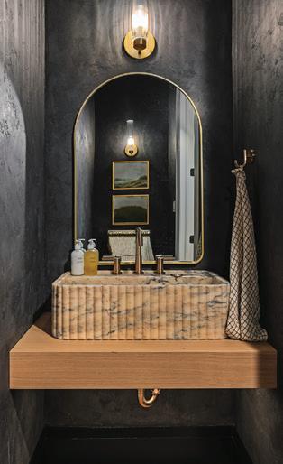 like you’re swimming. It is a little bit sexy, as it’s clear.” The four-by-sevenfoot windows provide loads of natural light in the bathroom and face the back of the property. The trees there provide cover while you soak in the tub, set on a luxurious porcelain tile, designed to mimic the look of natural travertine. “It feels like a spa,” says Crncich, who adds that this ensuite is her favourite room in the house.