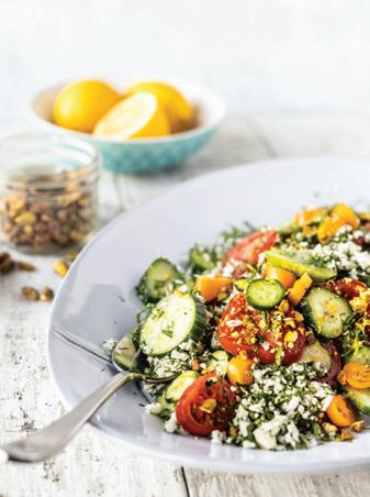 4. When the cauliflower is cool, add the parsley, dill, mint, tomatoes, cucumbers, and green onions. Add some of the pistachio lemon dressing and stir together so that everything is well dressed, then season to taste with salt and pepper.