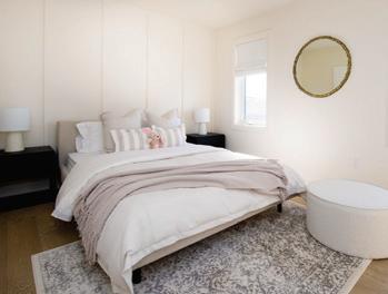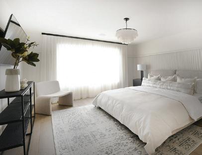 BELOW The primary bedroom features soft textures in the upholstered headboard, boucle chair and drapery. Black accents add punch in the bedroom and ensuite, where the faucets, glass shower door trim and sconces framing the mirrors also pop in black.