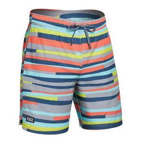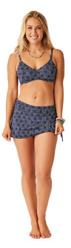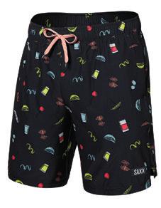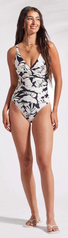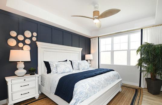 Two bedrooms provide golf course views: one is decked out in teal, pink and fl amingo, while the other fl aunts blue, white and starfi sh. The main bedroom features a navy millwork wall, continuing the nautical theme. It includes a large walk-in closet and ensuite. Gold faucets, hardware and shower frame add some Miami glitz.