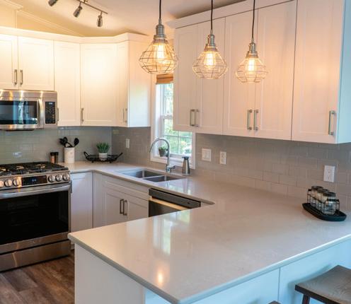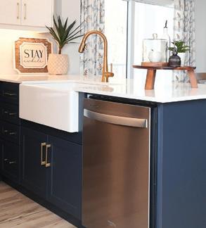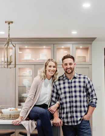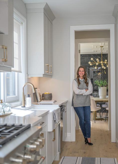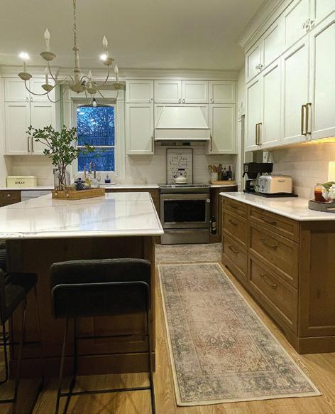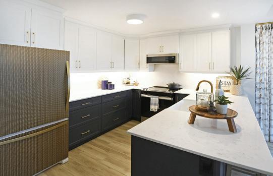 OPPOSITE PAGE The prize home’s kitchen is on trend with two-tone cabinets, a waterfall quartz countertop and full-slab backsplash.