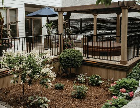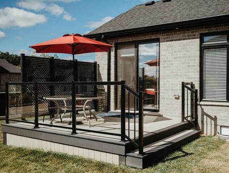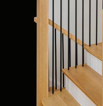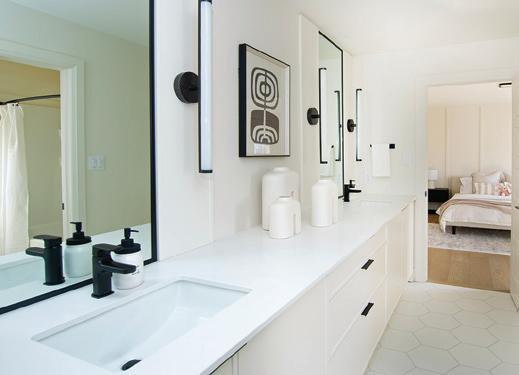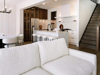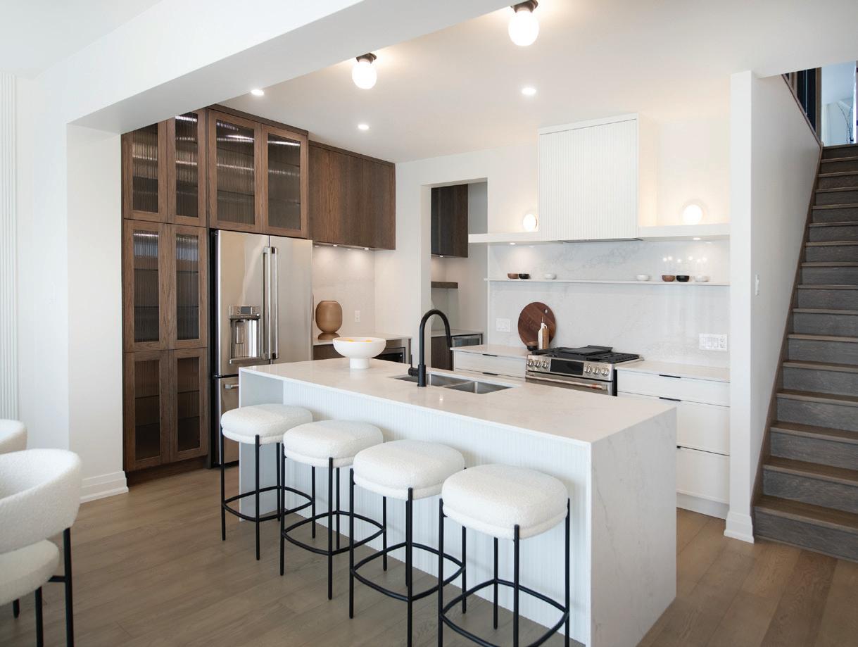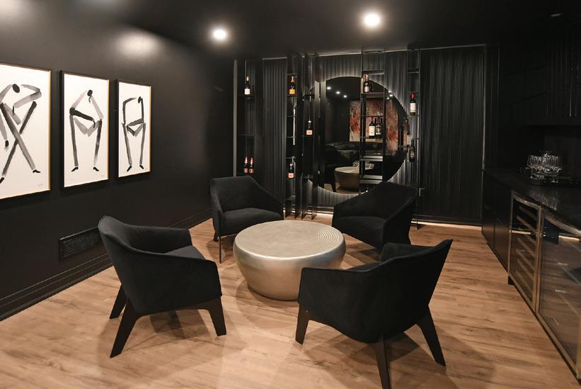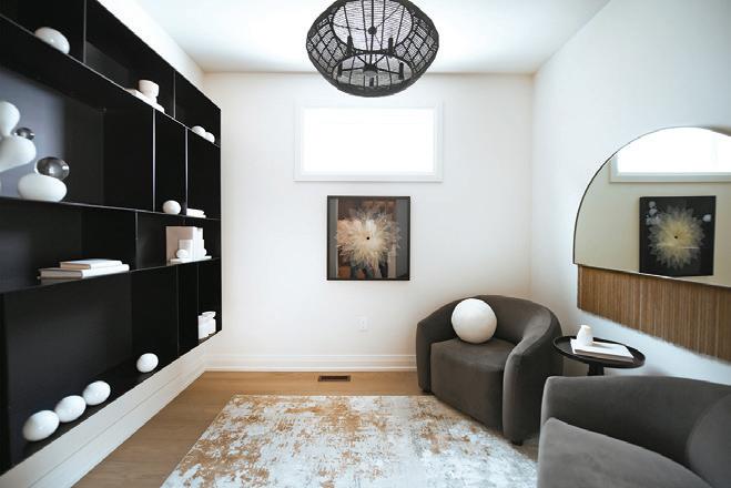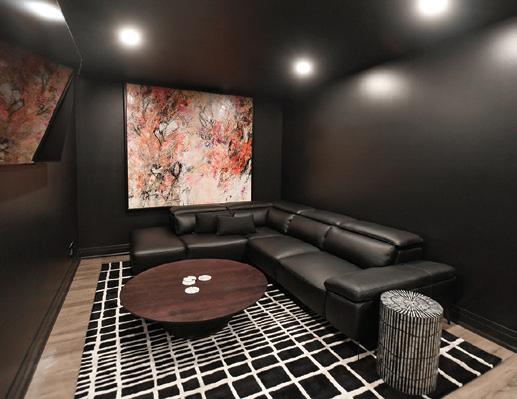 Descend the black, side-lit stairs to the “speakeasy” on the lower level. The mood is set by colour-drenched walls in black, smoked antique mirror tiles over the bar and sexy lighting. Nine-foot ceilings, a 75-inch television and a black sectional from Modern Living London are ready for binge time. Metal built-ins display bottles in front of a back-lit mirror and black tambour millwork. The long bar runs under the window and provides storage and two bar fridges. A fl ex room, a threepiece bathroom and a large utility complete the basement.