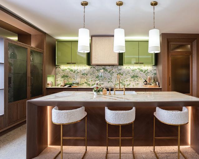 Ambient floor lighting in the dining area showcases the tambour wall treatment, and solid marble tops a metal dining table. “We’ve mixed metals throughout,” says Morphy. Dining chairs and island stools invite luxury lingering, covered in thick boucle fabric.