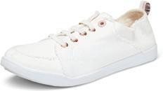 Kitchen and bathrooms feature blue or white cabinetry and white counters and tile. The fridge door is wrapped in a