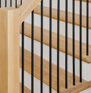 • Exposed wooden beams accent the vaulted ceiling in the open living/dining/kitchen space. • Descend the black, side-lit stairs to the “speakeasy” entertainment zone on the lower level. • A cozy reading room/office space has custom metal display shelves.