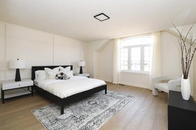 In the main ensuite, a private water closet, large shower, double vanity and tub create a spa-like retreat. “The quartz vanity counter drops down like a waterfall,” says Gallo. “There are automatic motion sensors for the lights.”