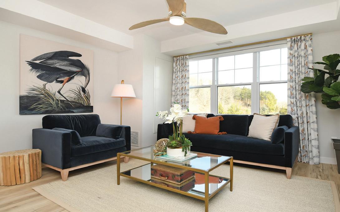 A pendant light, topped with a pineapple detail and leaf-shaped paddles on the ceiling fan, continue the tropical vibe. Navy velvet seating invites relaxation in the living area. A balcony off the great room is a great place to enjoy the view.