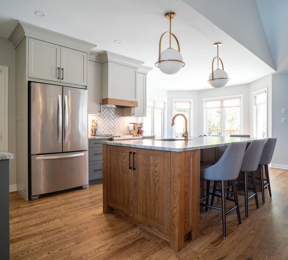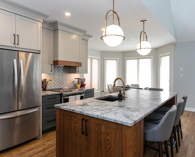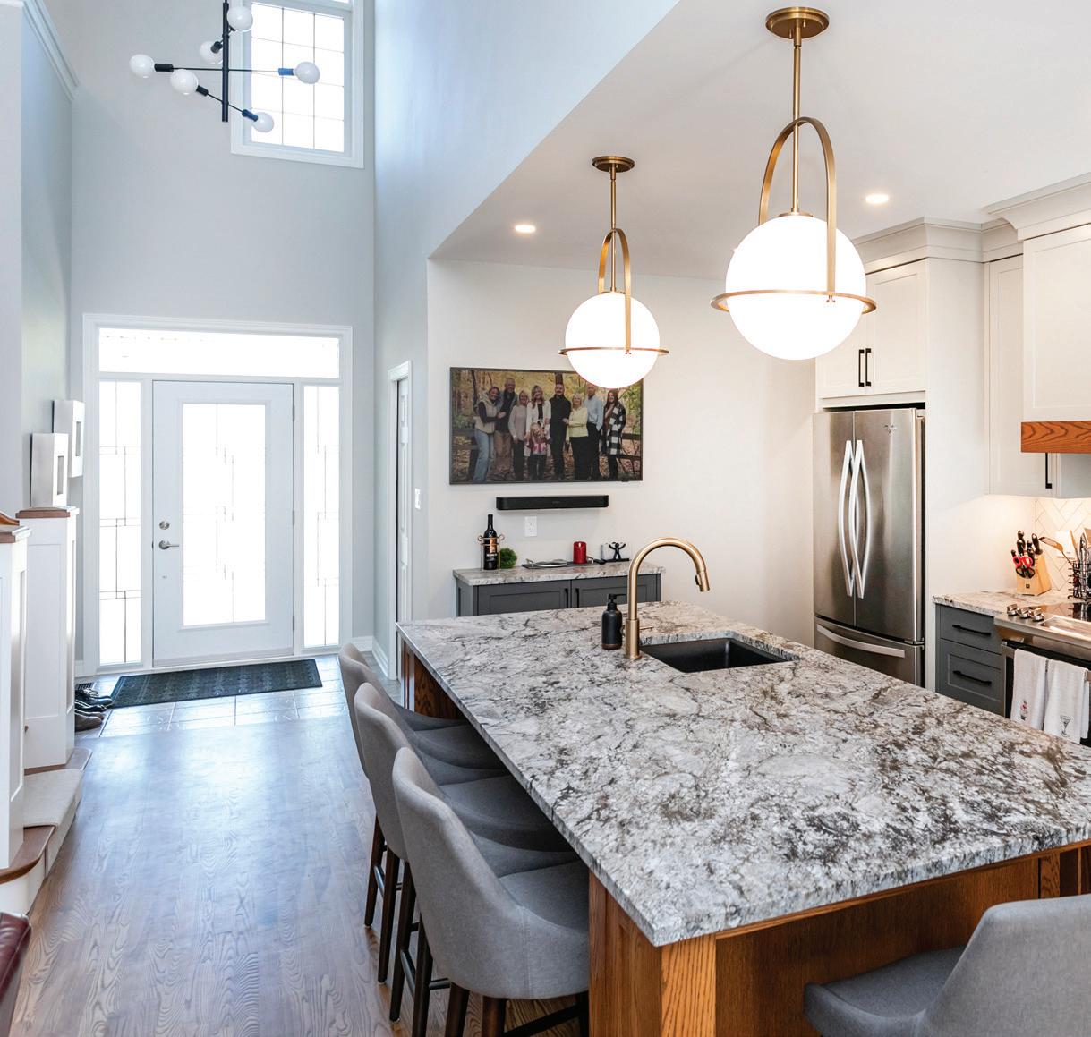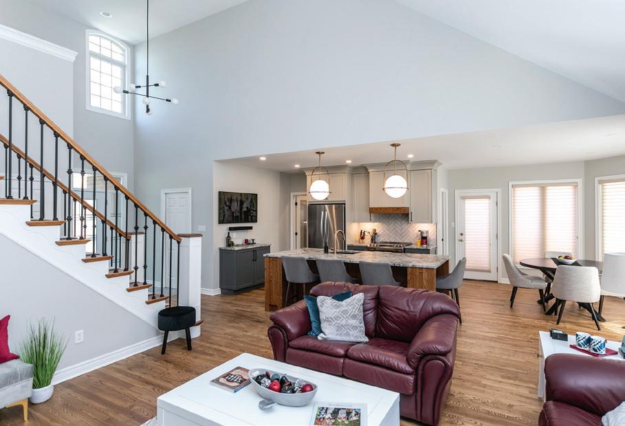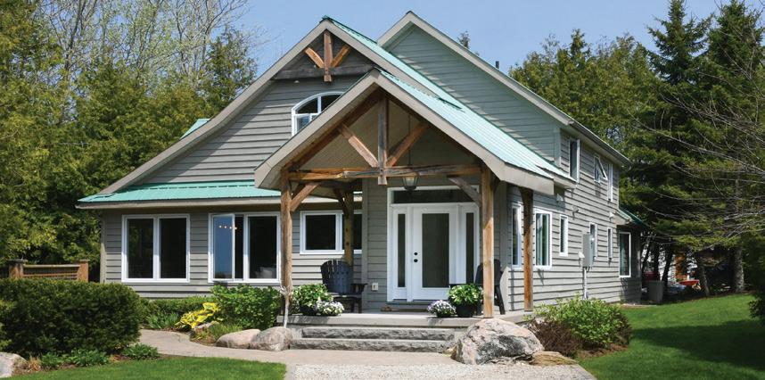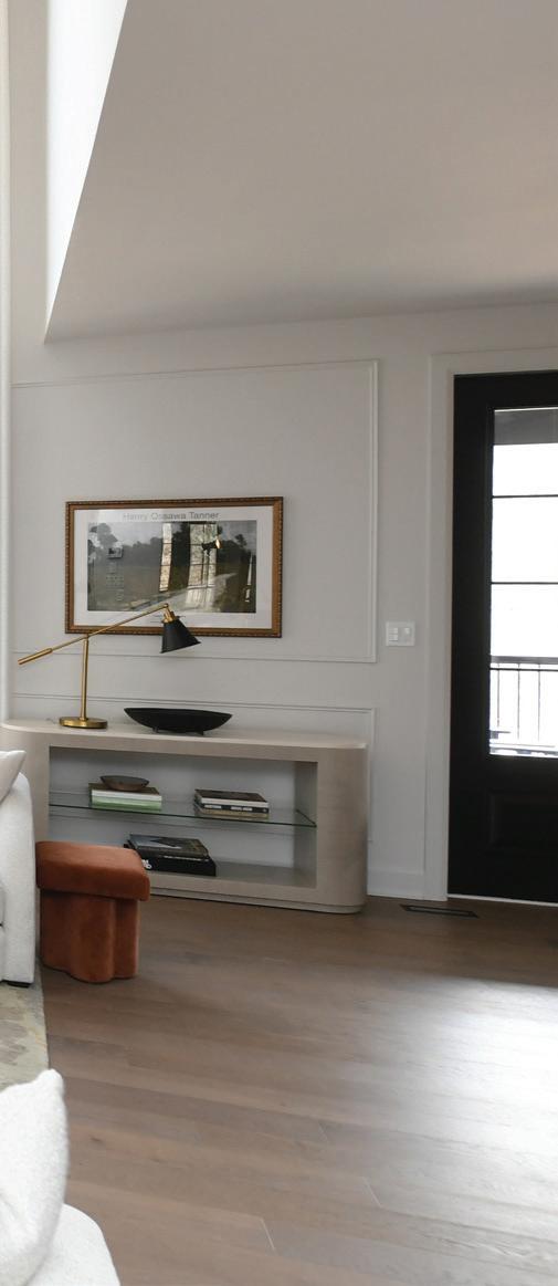 mostly recycled material and even the concrete is a special low-emission mixture. The lot, which backs on to Warbler Woods — prized for its flowering plants, trees, wildlife and trails — influenced much of the design inside and out. “The plan was customized to take advantage of the surroundings,” says Brown. “The woods drove the design. The overall aesthetic is natural, not really modern so it would blend with its neighbours.”