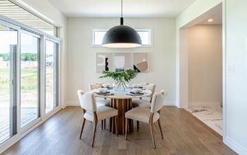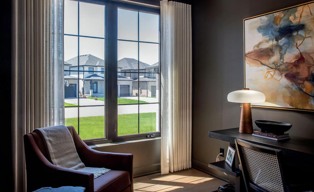 Reflecting its earth-friendly profile, the home’s colour scheme is subtle and soothing, with some moody punctuations, as in the main floor’s multi-purpose room, which can serve as an office, den or guest bedroom. Sifton’s interior decorating team selected colours, textures and finishes to create a calming feeling rather than a specific look.