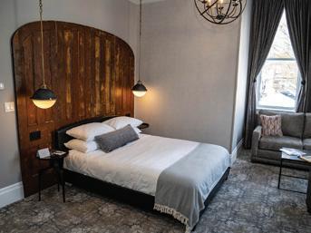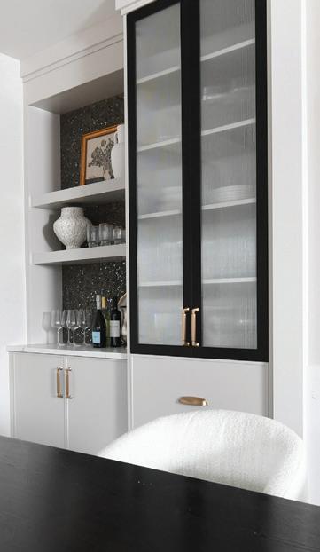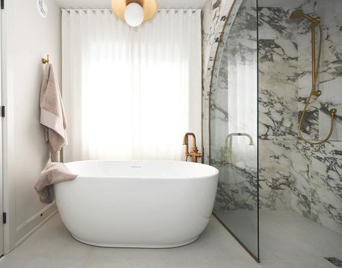 “The footprint of the primary bedroom is smaller, but it still feels spacious” says Brown. “We wanted something calming. You wake up, open the doors and it’s like a sanctuary.” It echoes themes from downstairs in ribbed quilting, reeded glass, arches, including one that defines the shower in dramatic tile. “I love arches,” says Brown. “They create individual spaces that make them more special. They create a sightline looking through a doorway, so you want to go in and see it.”