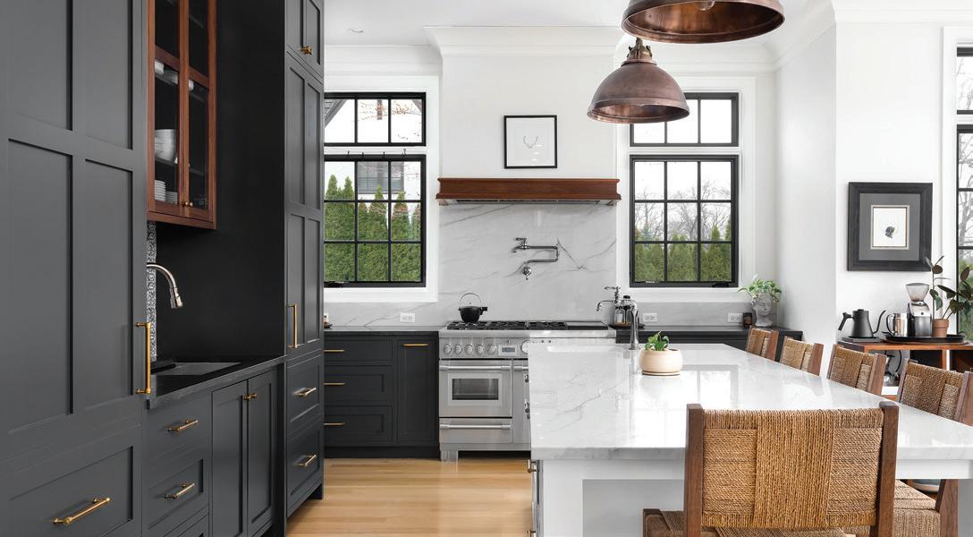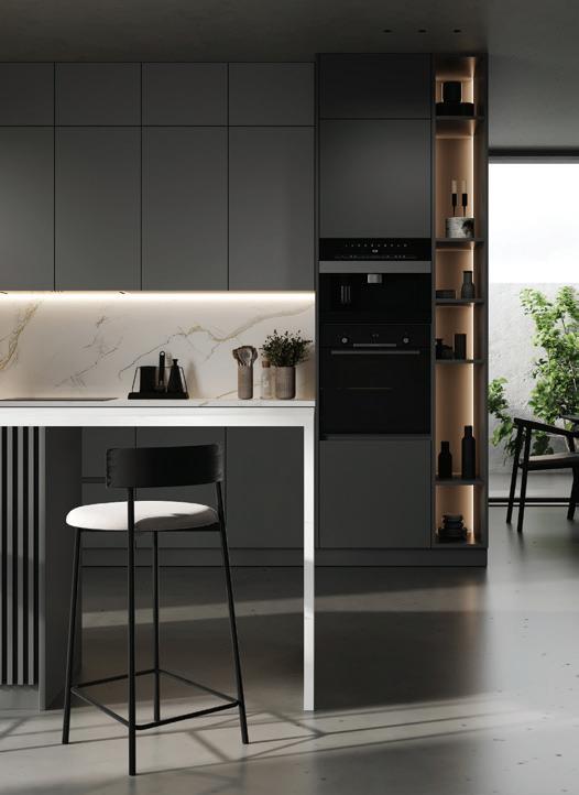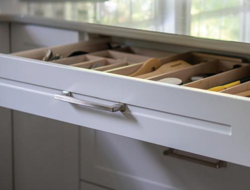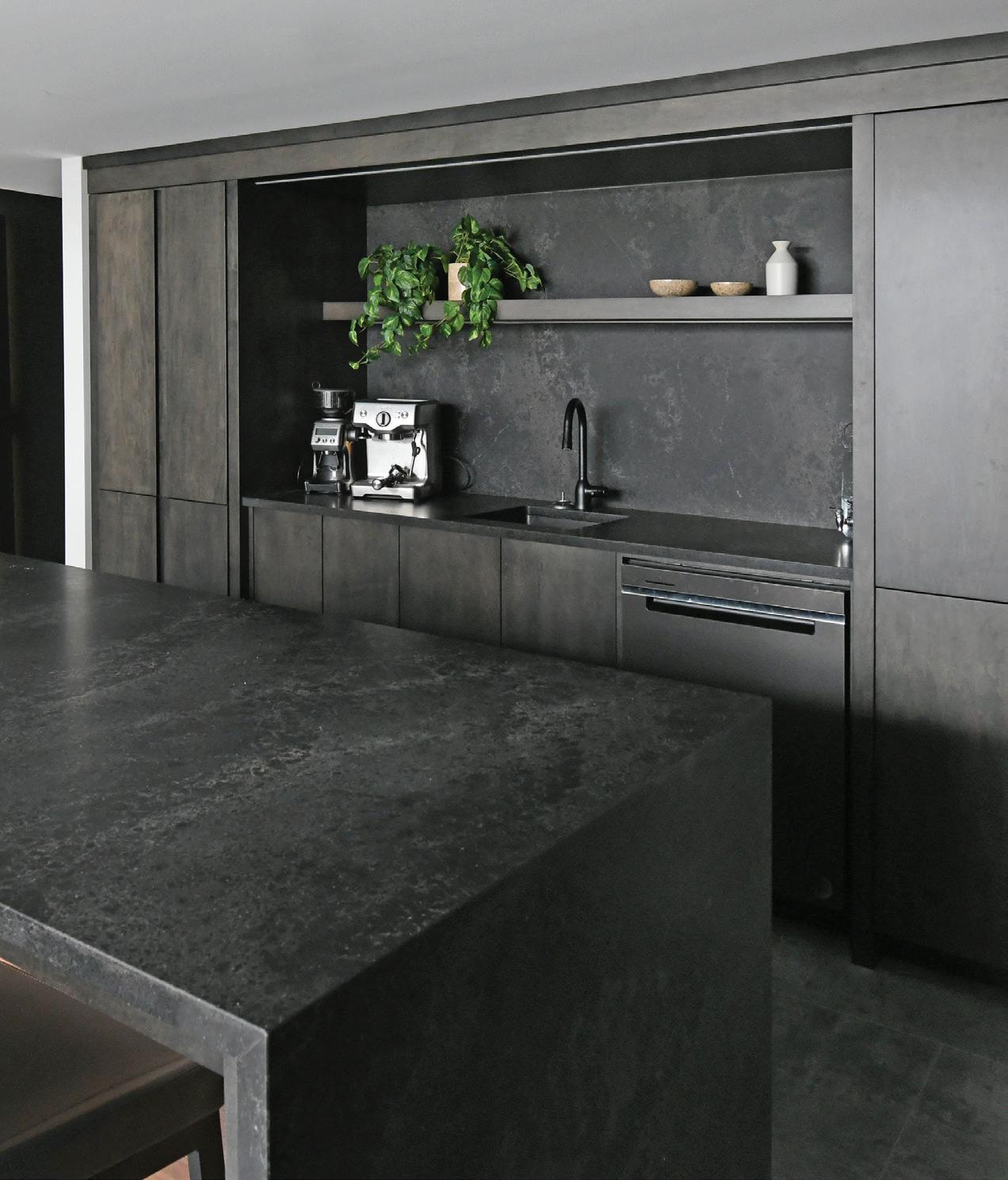 drawer, sink and storage. It’s one of the few spaces with rich colour. An oversize island and hood dominate the kitchen.