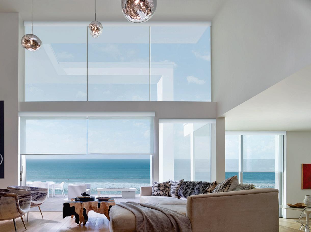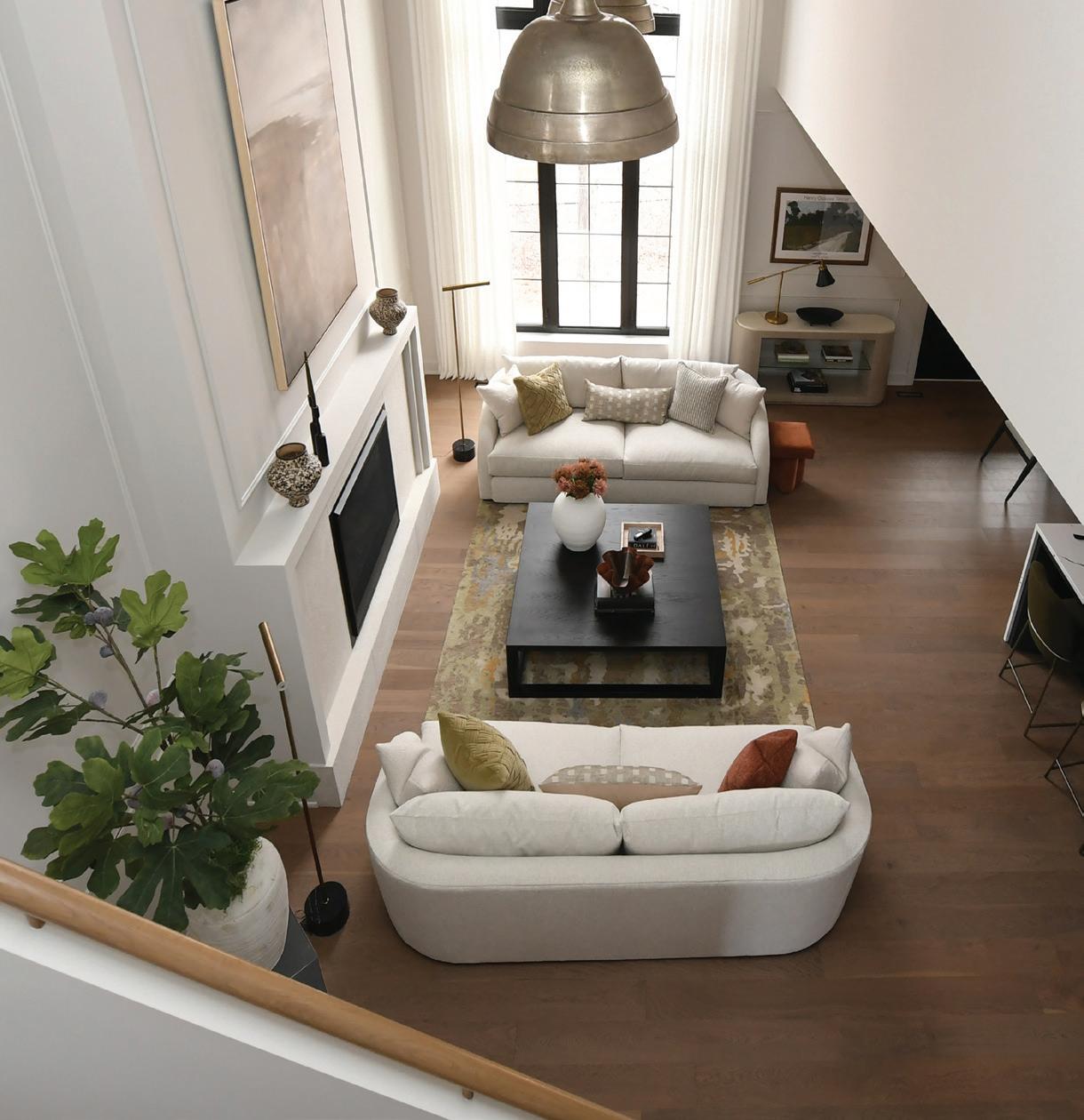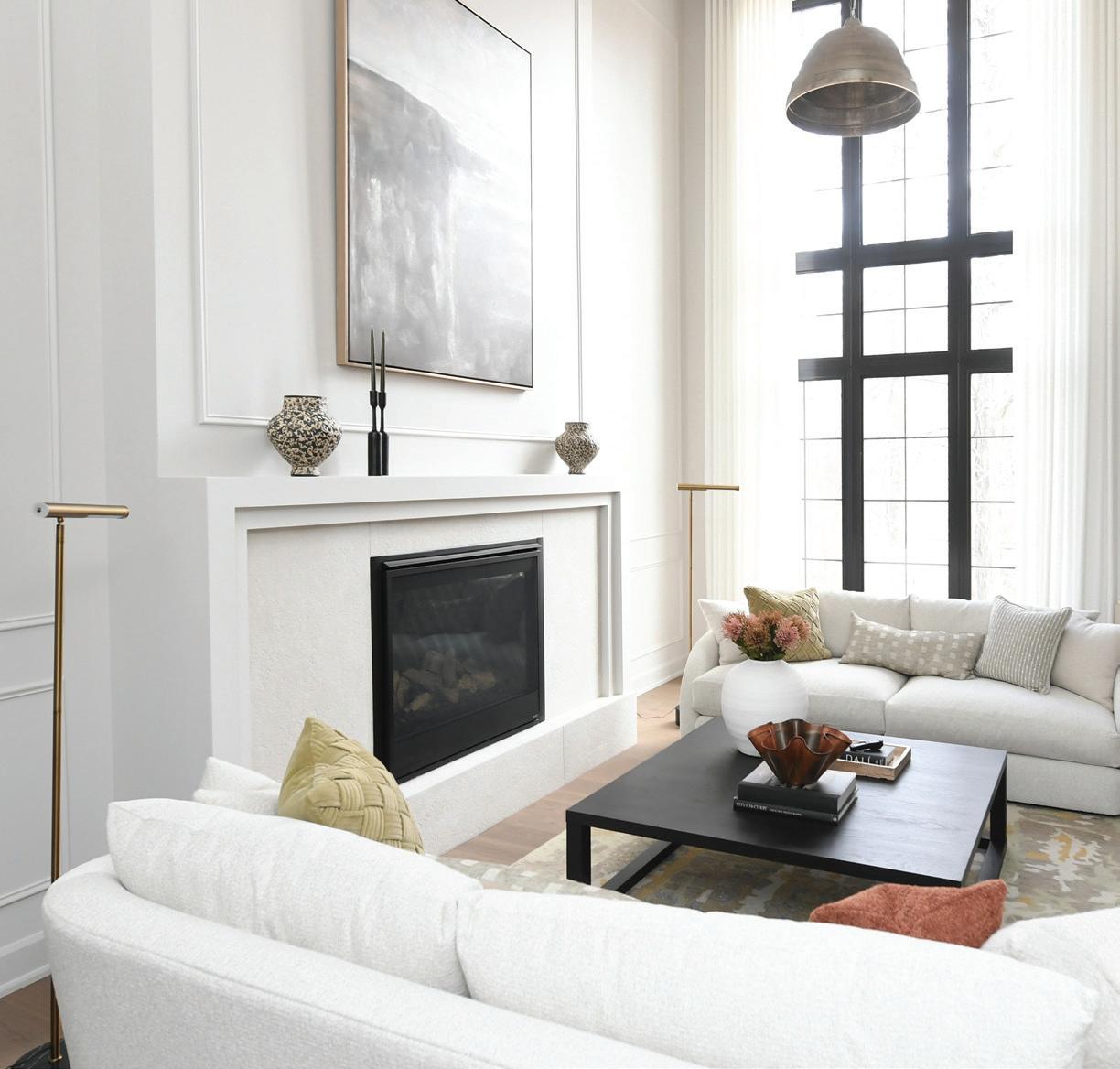 The back opens to the woodsy view, with soaring windows and double terrace doors to the deck. Emily Lebrun-Zandri, junior designer, says the layering of textures in neutral tones set the theme. An oversize fireplace, with step-back mantel, balances the windows.