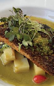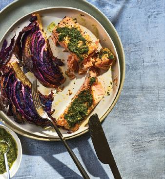 6 Roast the salmon and cabbage for 15–20 minutes, until the fish is 145°F. Fish is perfectly cooked when the thickest section gently flakes when punctured with a fork. Once the fish is cooked, remove from the oven and generously spoon the zhoug over the fish and cabbage. •