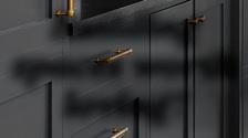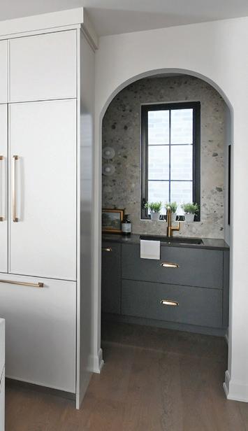 One motif is fluting, seen on the back of the kitchen island, glass pocket doors, bar cabinet and linen tower. Another is soft, cozy fabrics, such as boucle and velvet. Metals and stone play a role, from