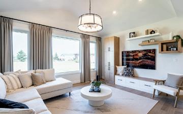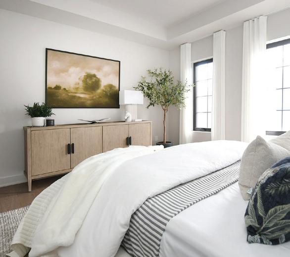 The primary bedroom and its ensuite offer a sanctuary-like feeling, as the large windows overlook nature’s beauty and the interior calms with subtle colours and textures. Arches are used to advantage, creating inviting rooms in which to relax. The ensuite typifies the project’s use of materials chosen for energy efficiency, while catering to current homebuyers’ tastes and needs for beautiful, functional spaces. The walk-in closet is a large, sumptuous space with plenty of organized storage.