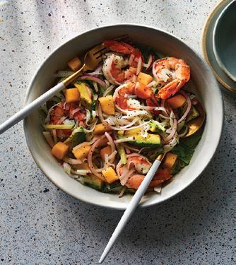 4 In a large bowl, toss together the shrimp, radishes, cucumber, snap peas, cantaloupe, red onion, and noodles. Pour the vinaigrette overtop and toss to coat.