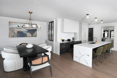 The kitchen opens to the woodsy view, with soaring windows and double terrace doors to the deck, taking advantage of the lot’s position. It backs on to Warbler Woods and its lovely vistas of flowering plants, trees and wildlife. Nature’s rich colours are reflected in the green bar stools and brown flooring, contrasting with dark and light shades of grey. There’s space for entertaining, with seating in the eating area and at the island.