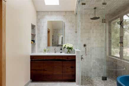 From there, the design extends into the landscape. “What I've enjoyed about this project is that it feels warmer and more naturalized,” says Julia Dullien, Associate and Landscape Architect at Marpa Landscape Architecture & Construction. “It blends into its surroundings in a way that's refreshing and very reflective of the owner.” She describes the home as whimsical, with a series of small moments: a breezeway, courtyard, wellness studio, and pathways that “create a sense of coziness. It's like a hug.”