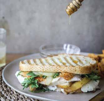 Spread goat cheese on one side of the bread. Top the cheese with arugula, caramelized onions, sliced pears and chicken breast. Drizzle with honey. Top with remaining slice of sourdough bread. Use a griddle or panini press to heat the sandwich.