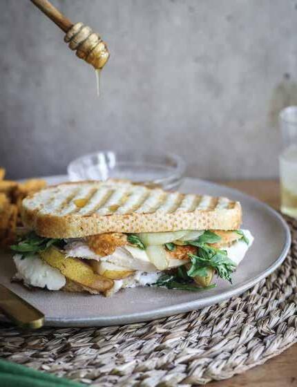 Spread goat cheese on one side of the bread. Top the cheese with arugula, caramelized onions, sliced pears and chicken breast. Drizzle with honey. Top with remaining slice of sourdough bread. Use a griddle or panini press to heat the sandwich.