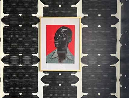 This powder room was inspired by the beautiful pattern in this wallpaper, Demerara Groove, created by local artist, Kisha Damali. The moment I saw it I was stunned. I love the stark contrast between the black and white, the subtle texture layered in the pattern, the movement, and the ancestral history embodied in its name. I echoed contrast in the gold and black metals of the fixtures and decorative elements, balanced with a warm walnut wood vanity. The art prints I selected demonstrate the power and beauty of Black people. DESIGNER SPOTLIGHT: ROBIN GAHAN | MARBLE MOON INTERIORS