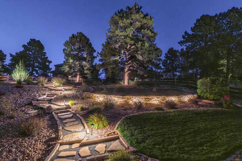 While the company offers everything from deck and patio lighting to festive string lights and permanent holiday displays, Gina admits, “We really love doing landscapes, especially backyards. Colorado has so many water features—fountains look incredible when lit just right. It’s where we get to be the most artistic.”