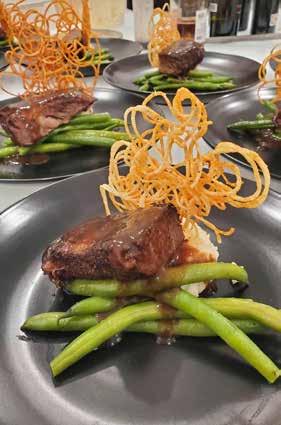 “If there is no texture to a plate, consider adding a nut or crispy garnish such as thinly sliced fried carrots or leeks,” Chef McCombs says. “The mentality of plating is high and tight—keep food tight in the center and strive to build up instead of out.”
