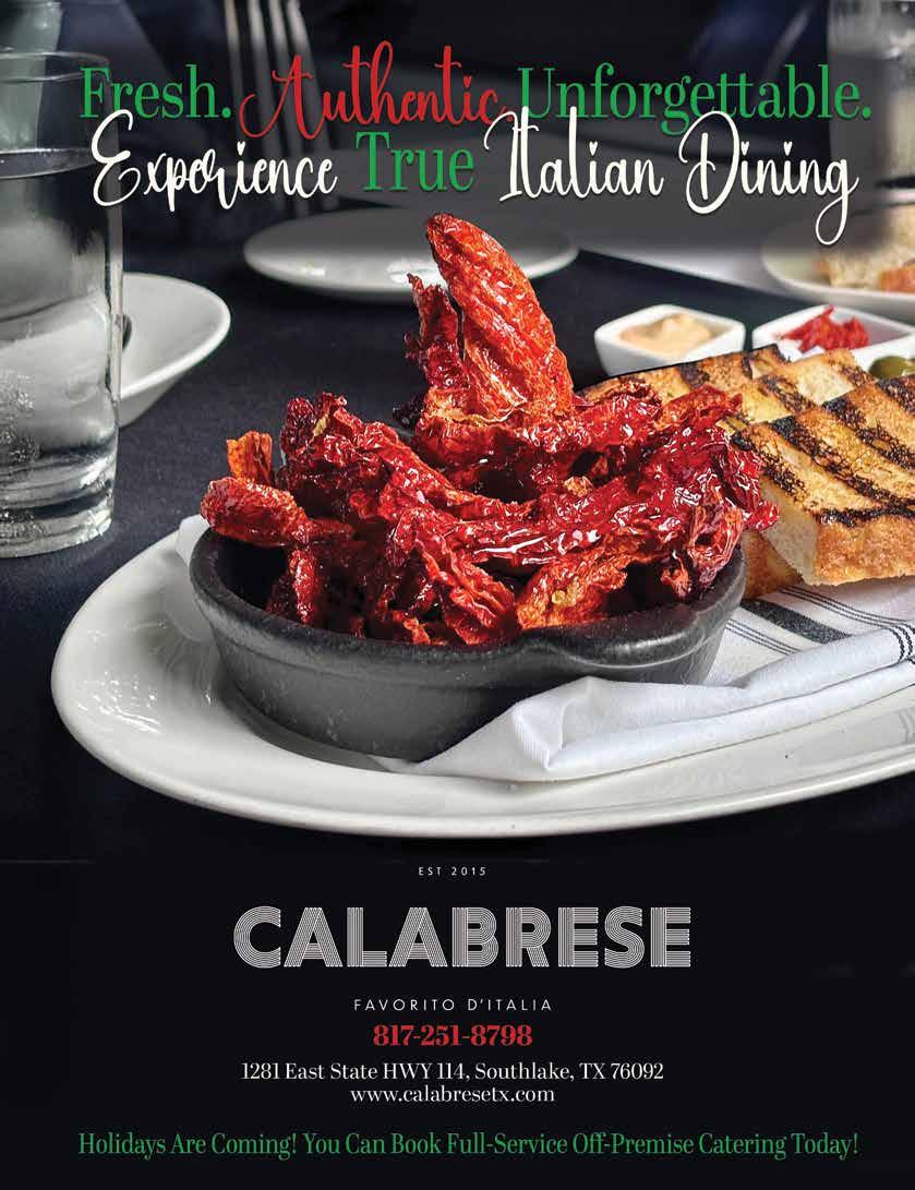 When you sit down at Calabrese, one of Southlake’s most beloved Italian restaurants, bold flavors arrive before the first plate even touches the table. Warm bread emerges from the kitchen, its crust soft enough to break by hand, and alongside it comes a dish of butter so fragrant it almost speaks for itself. A waitress leans in with a smile and offers a secret: “This butter is infused with herbs grown in our own garden.”