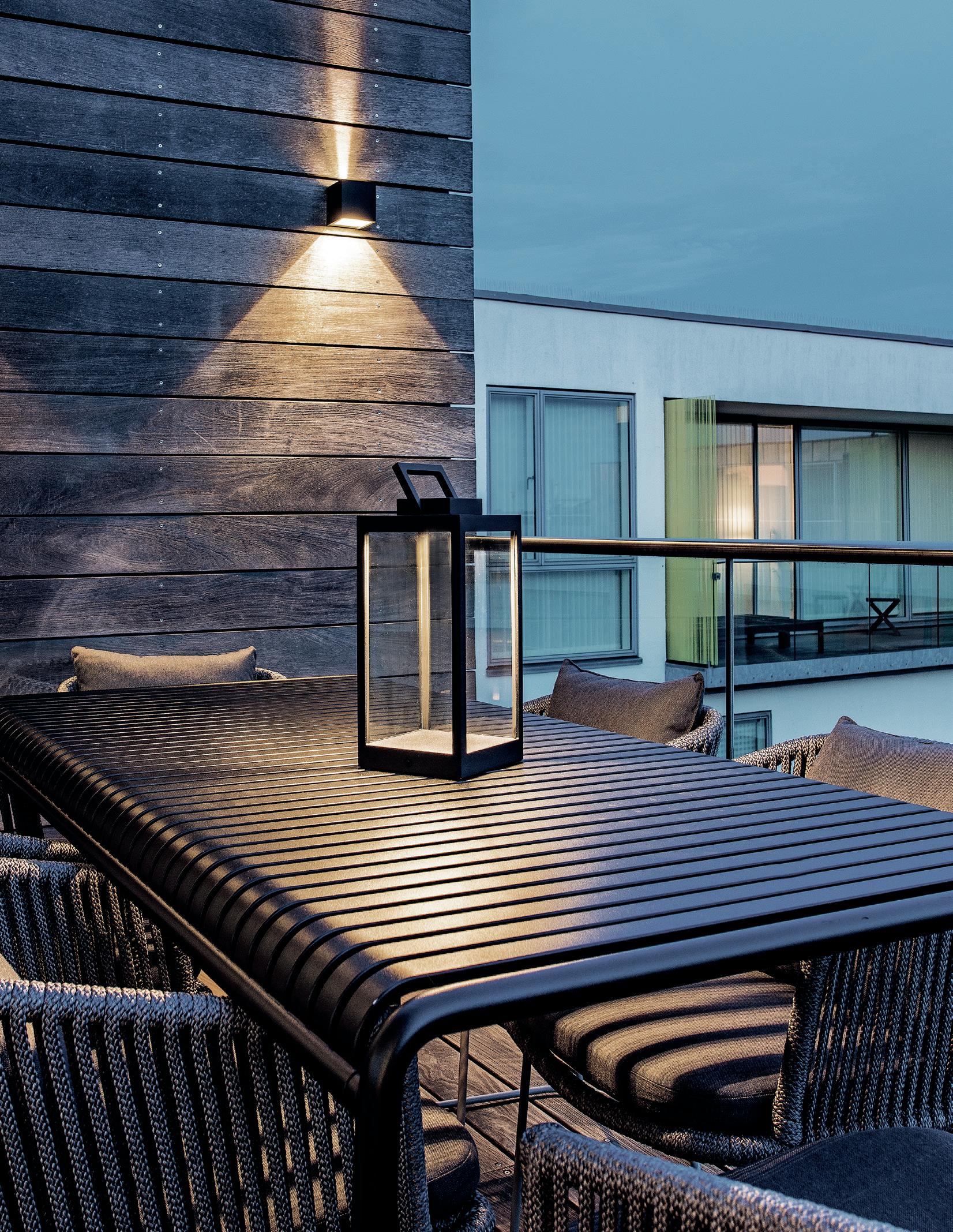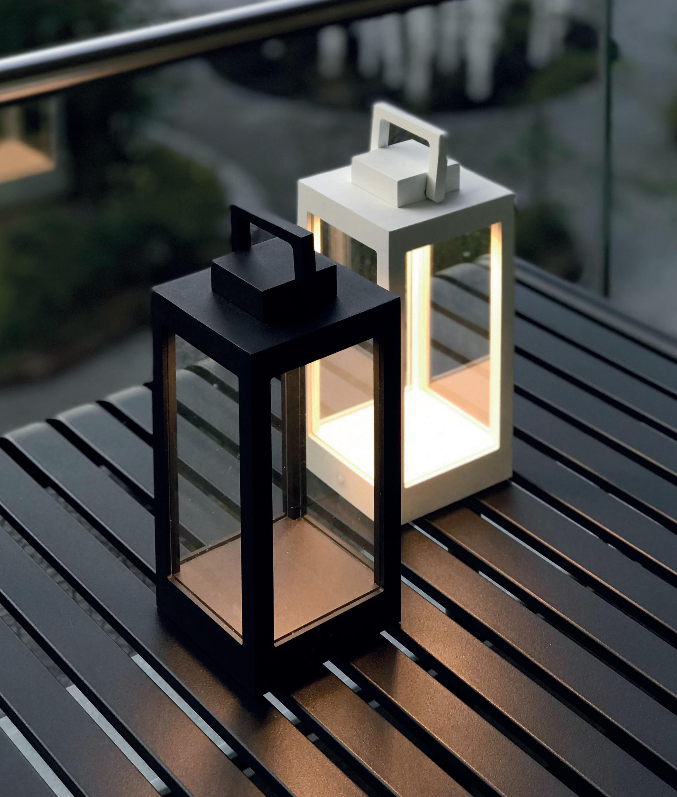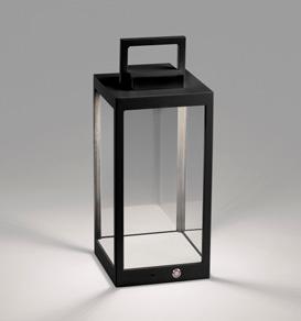 LANTERN collection is based on the contemporary interpretation of a classic lantern. Rectangular glass panels framed by black lacquered aluminium combine to form a cuboid. The indirect LED source creates an interplay of geometric areas of light and shades, lending the collection an architectural appeal.