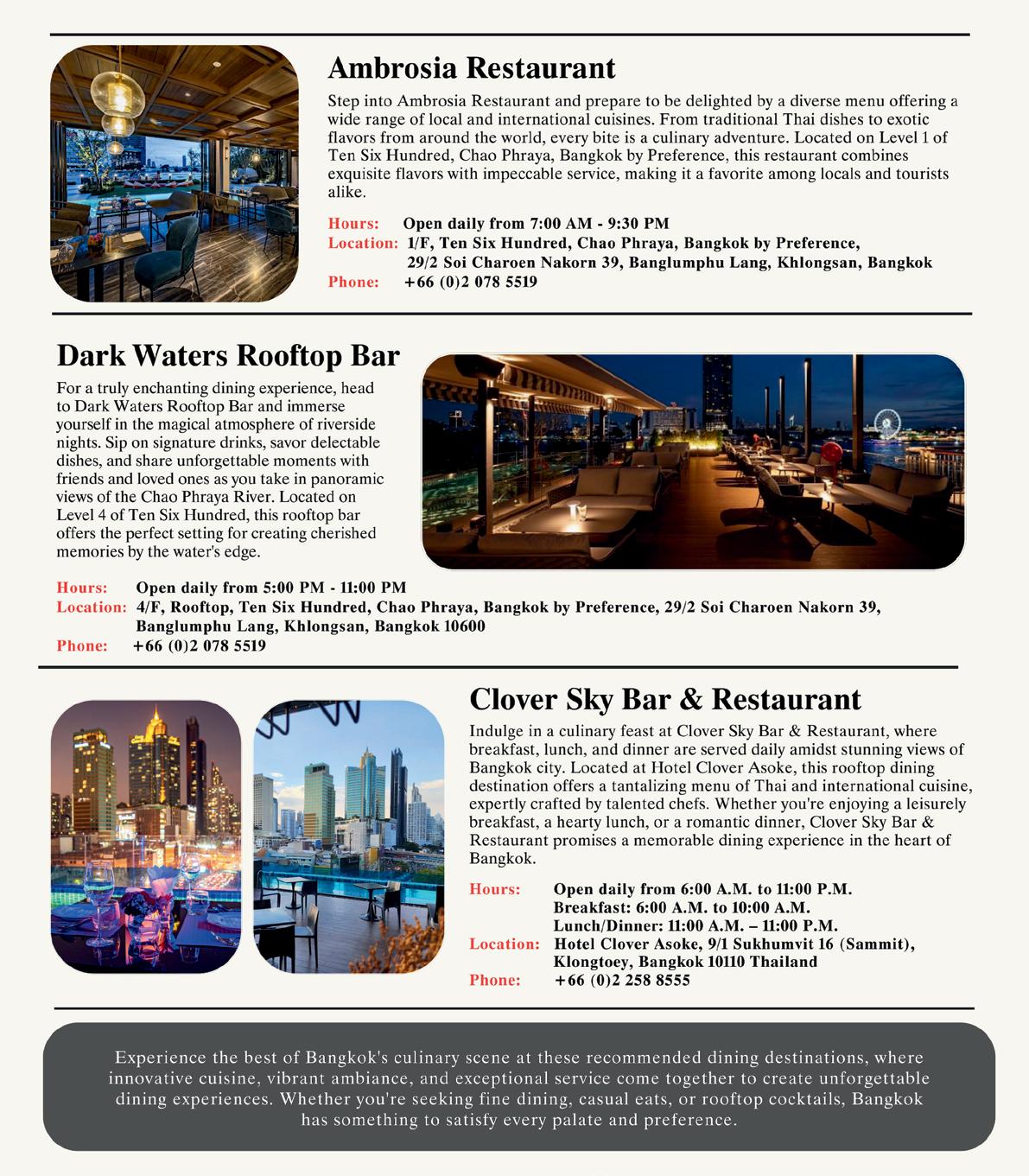 Indulge in exquisite dining at Ambrosia Restaurant, renowned for its warmth, luxury, and elegance, accommodating up to 50 guests. For a more relaxed experience, unwind and enjoy drinks at Dark Waters Rooftop Bar while soaking in the stunning sunset views of the Chao Phraya River.