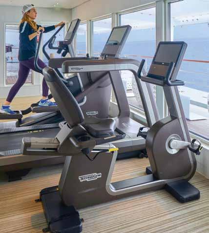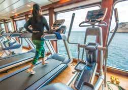 From top: Relaxing in the library; onboard gym with million-dollar views.