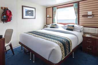 CABINS: All face outside with large windows, and feature single beds that convert to a queen. With private facilities and climate control, nightstands, desk, and storage. Seven sets of cabins with a connecting door.