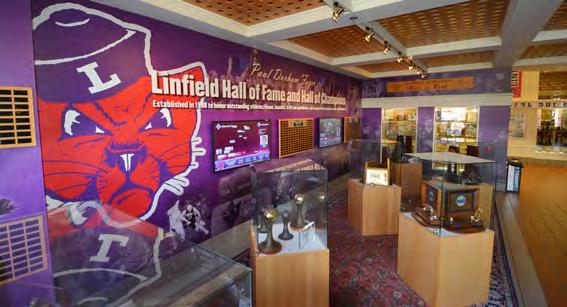 The numerous accomplishments of past championship teams and individuals from each of Linfield’s varsity sports programs now proudly encircle Wilson Gym’s court. Sixtysix banners now surround Wilson Gym’s playing surface and include every program with championship success. All team and individual national champions are recognized, as well as all national runners-up, both team and individual.