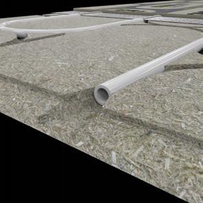 Covering chipboard layer is pre-cut with the pipe channel pattern, allowing the layer to slot precisely over the warm water pipes once installed in the chipboard layer.