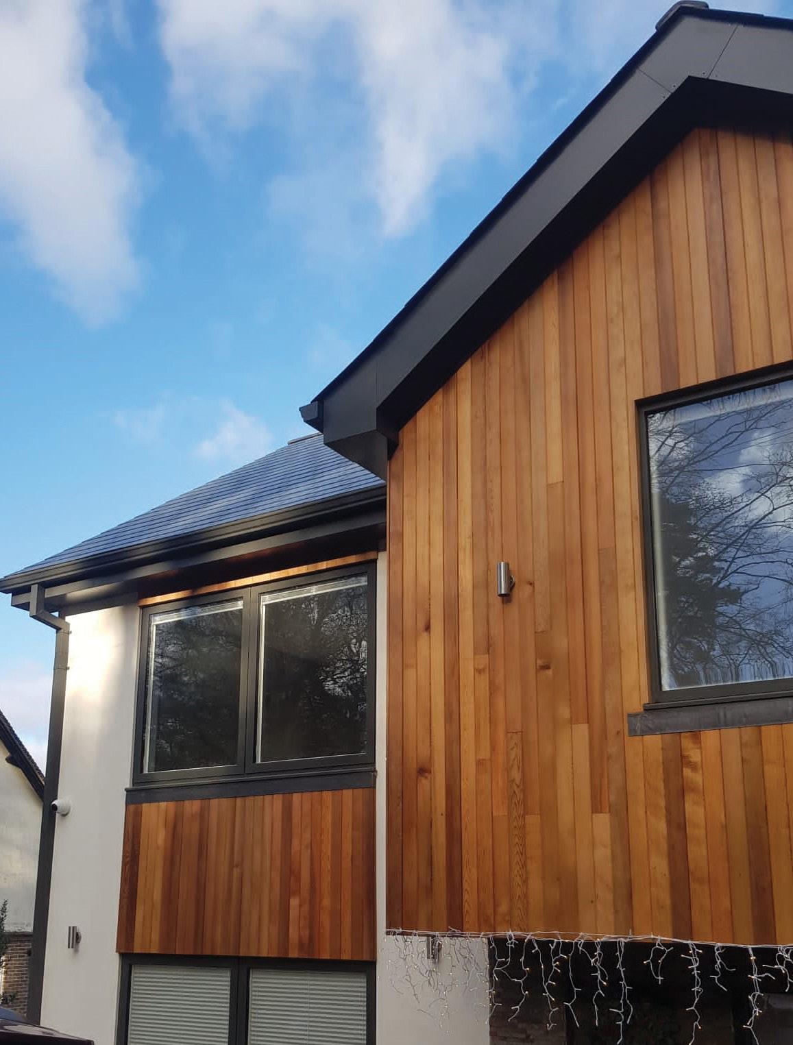 As part of the function and design criteria of the house façade, Yeoman Rainguard were able to provide a sophisticated, quality rainwater system to fulfil technical and aesthetic requirements. To dovetail into the contemporary look, Yeoman Rainguard SL Aluminium gutters and downpipes were chosen. The 75 x 75 mm flush-fit SL Aluminium downpipes provided a modern clean line coupled with 125 x 100 mm MOG gutter. Aluminium Fascia and Soffits from Yeoman Rainguard’s new Squareline range were fitted to complement the sleek lines.