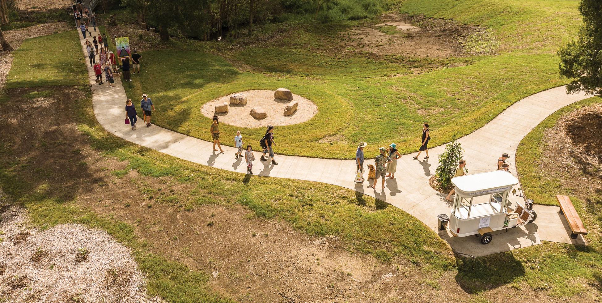 Featuring well-formed pathways, picturesque boardwalks and sturdy bridges, the 750-metre walk seamlessly blends into the surrounding landscape. Interpretive signage, locally crafted artworks, comfortable park furniture, a large timber pergola and more than 5700 new native plantings enhance the experience.