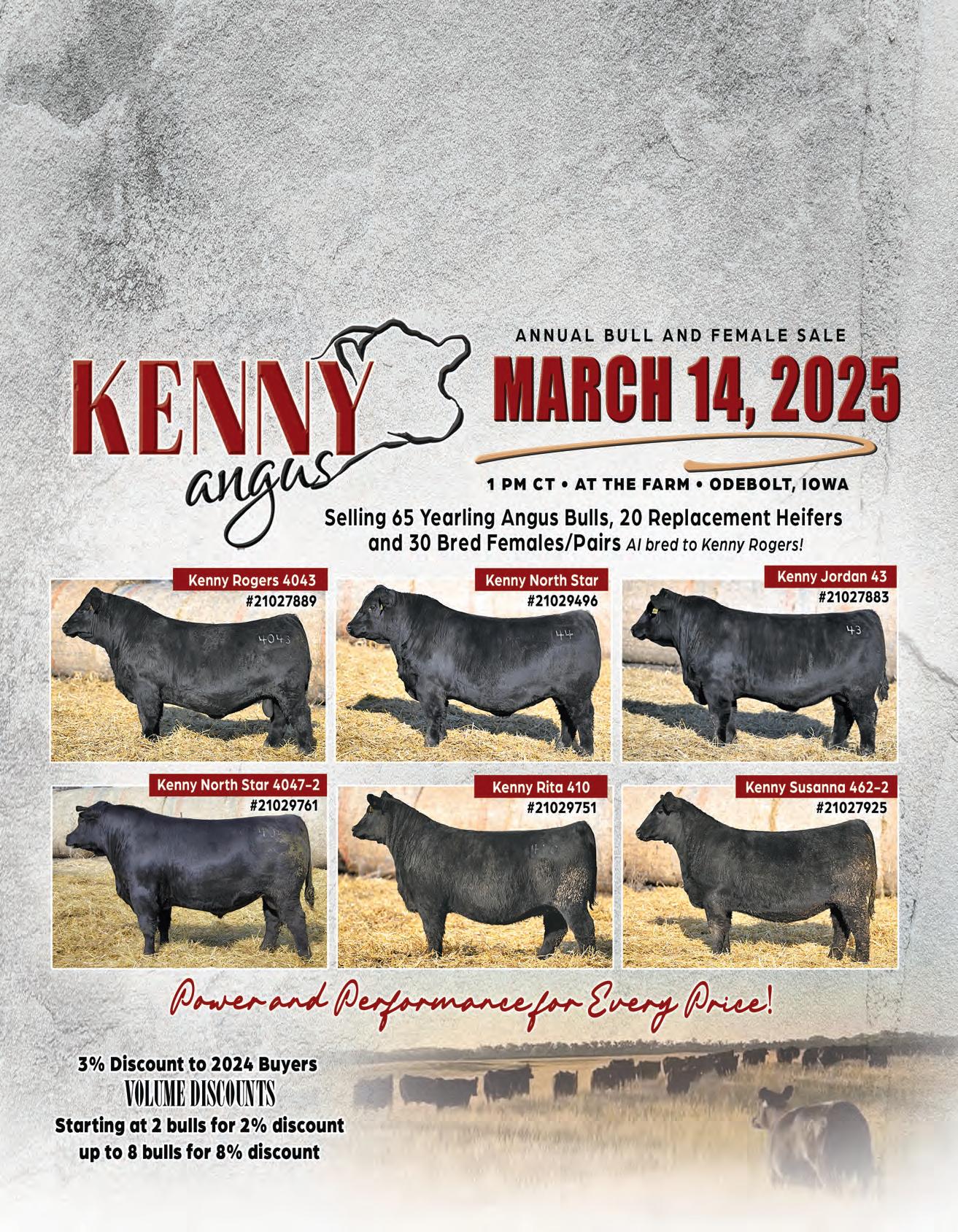 We welcome you to this year’s Annual Kenny Angus Production Sale. Whether you’re a long-time customer or exploring our offering for the first time, we’re happy to have you here and to introduce you to an exceptional lineup we are proud of.