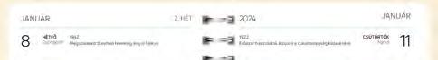 Tartalom: heti tervező, éves bontás, névnapok, állandó és változó dátumú magyar és nemzetközi ünnepek, eseménynaptár (minden napra egy érdekes történelmi esemény), jegyzetek