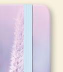 keménytábla, soft touch fólia, UV lakk, vakdombor, kerekített sarok, gumis rögzítő, 4 szín nyomott előzék 90 gr fehér ofszet, 2+2 szín