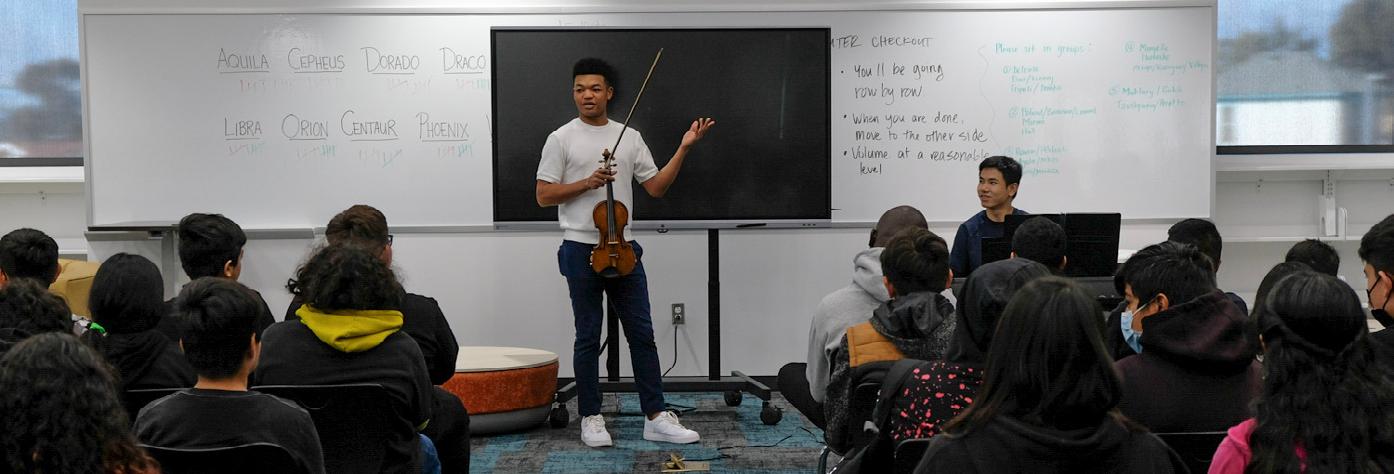 This year, the program introduced hundreds of San Diego children to live classical and jazz music, including a visit from Balourdet Quartet to Roosevelt Middle School for two sessions: a master class with the school's advance orchestra and a performance demonstration assembly for all the music students at the school.